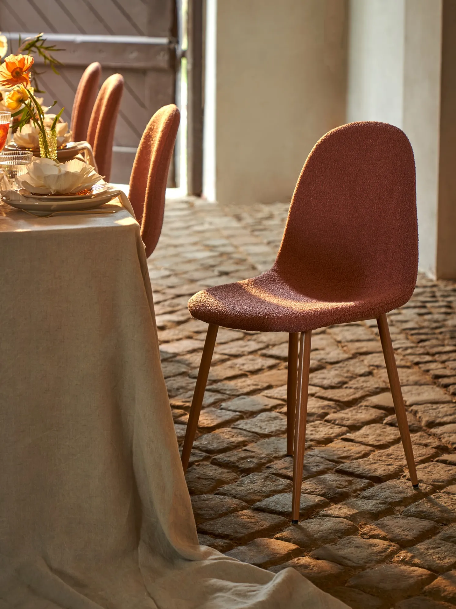 Der Stuhl mit Bouclé-Stoff ist STANDARD 100 by OEKO-TEX®-zertifiziert* und misst 40,5 x 44,5 x 89 cm, bei einer Sitzhöhe von 48,5 cm. Dieser Stuhl ist mit den folgenden Stuhlbeineinsätzen kompatibel: 508454-001.Es gibt nichts Schöneres als der Einklang von Funktionalität und Ästhetik, findet Clara. „Dieser praktische Stuhl sieht mit seiner interessanten Textur wunderbar dekorativ aus“, sagt sie. „Eine schöne Ergänzung für jede Einrichtung.“„Versuchen Sie vielleicht, ihn mit ähnlichen Stühlen zu kombinieren, die mit verschiedenen Stoffen bezogen sind, um einen dynamischen Look zu erzielen“, fügt Anna mit einem Lächeln hinzu und platziert den neuen Bouclé-Stuhl neben den ikonischen Samtstühlen der Schwestern.*SH040 191228 TESTEX