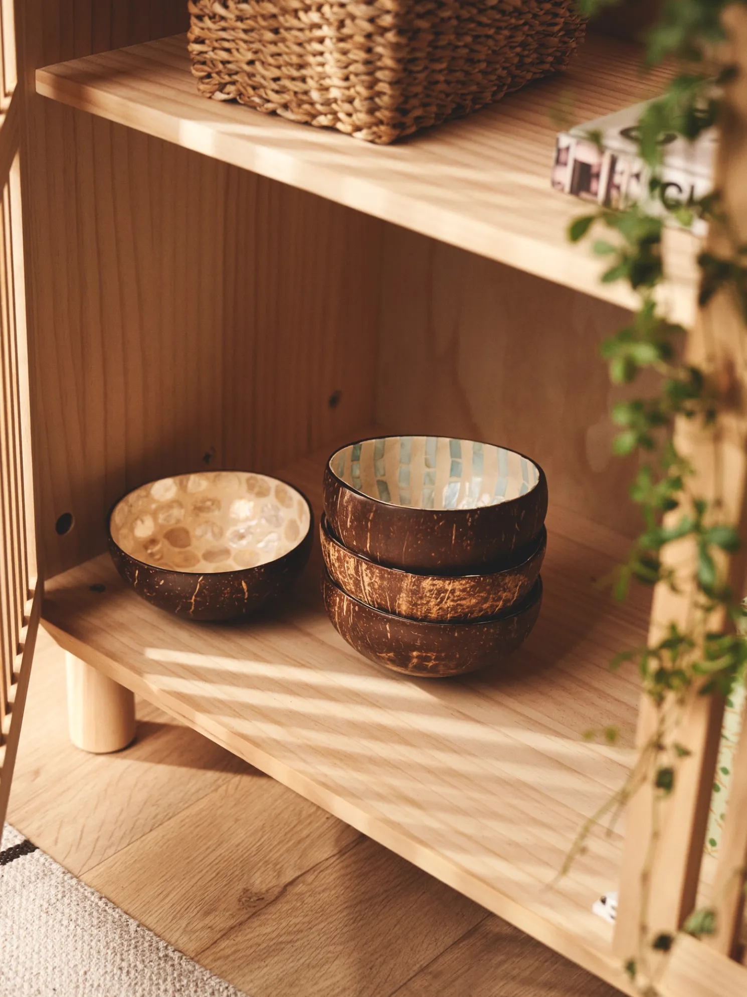 Die dekorative Schale der Schwestern besteht aus natürlicher Kokosnuss mit einer bunten Lackschicht auf der Innenseite.Die Schwestern weisen darauf hin, dass dieses Produkt aus einem natürlichen Material gefertigt ist und daher die in Größe, Farbe und Ausdruck leicht variieren kann. Sie ist auch nicht lebensmittelecht und dient rein dekorativen Zwecken.