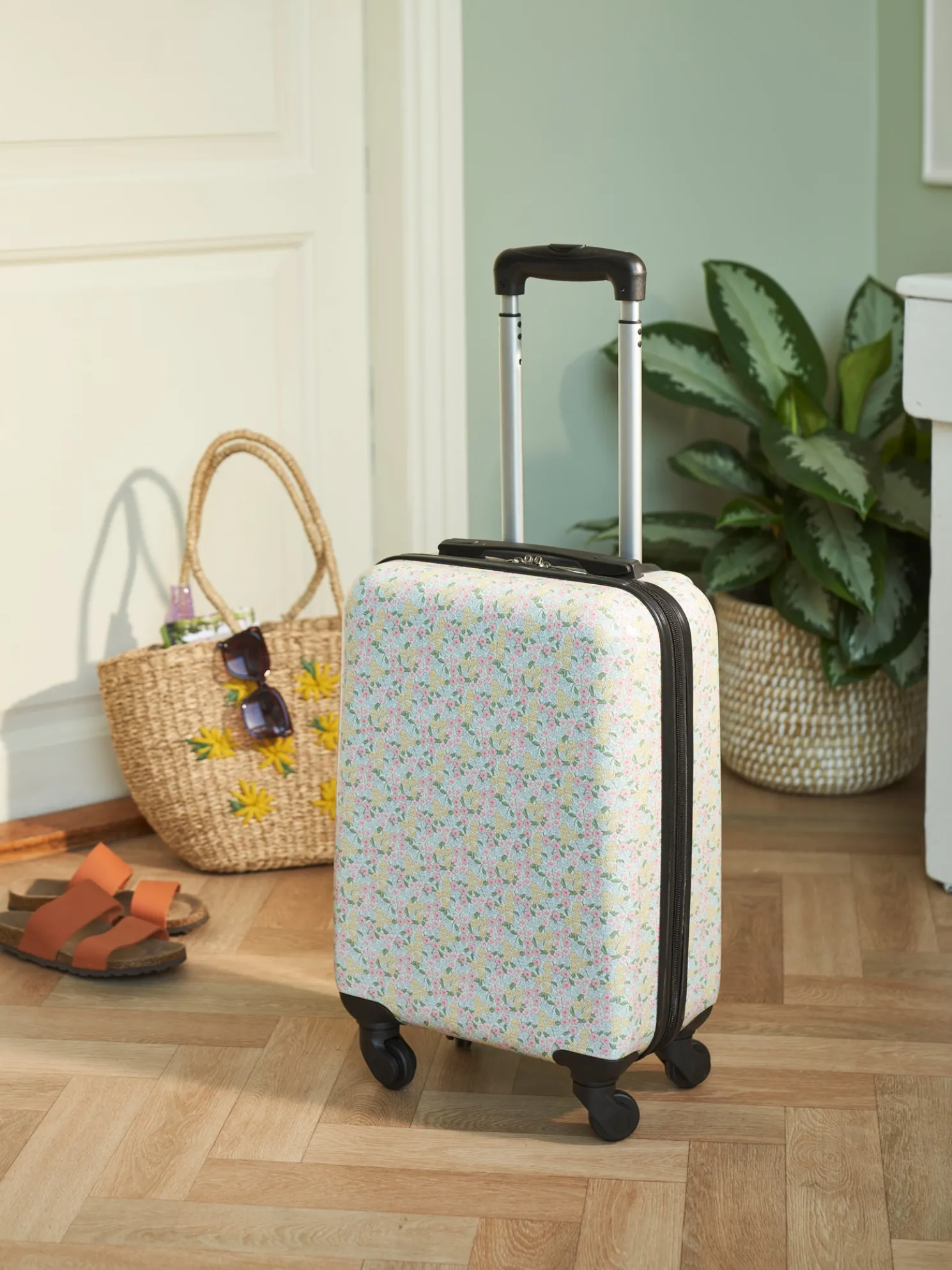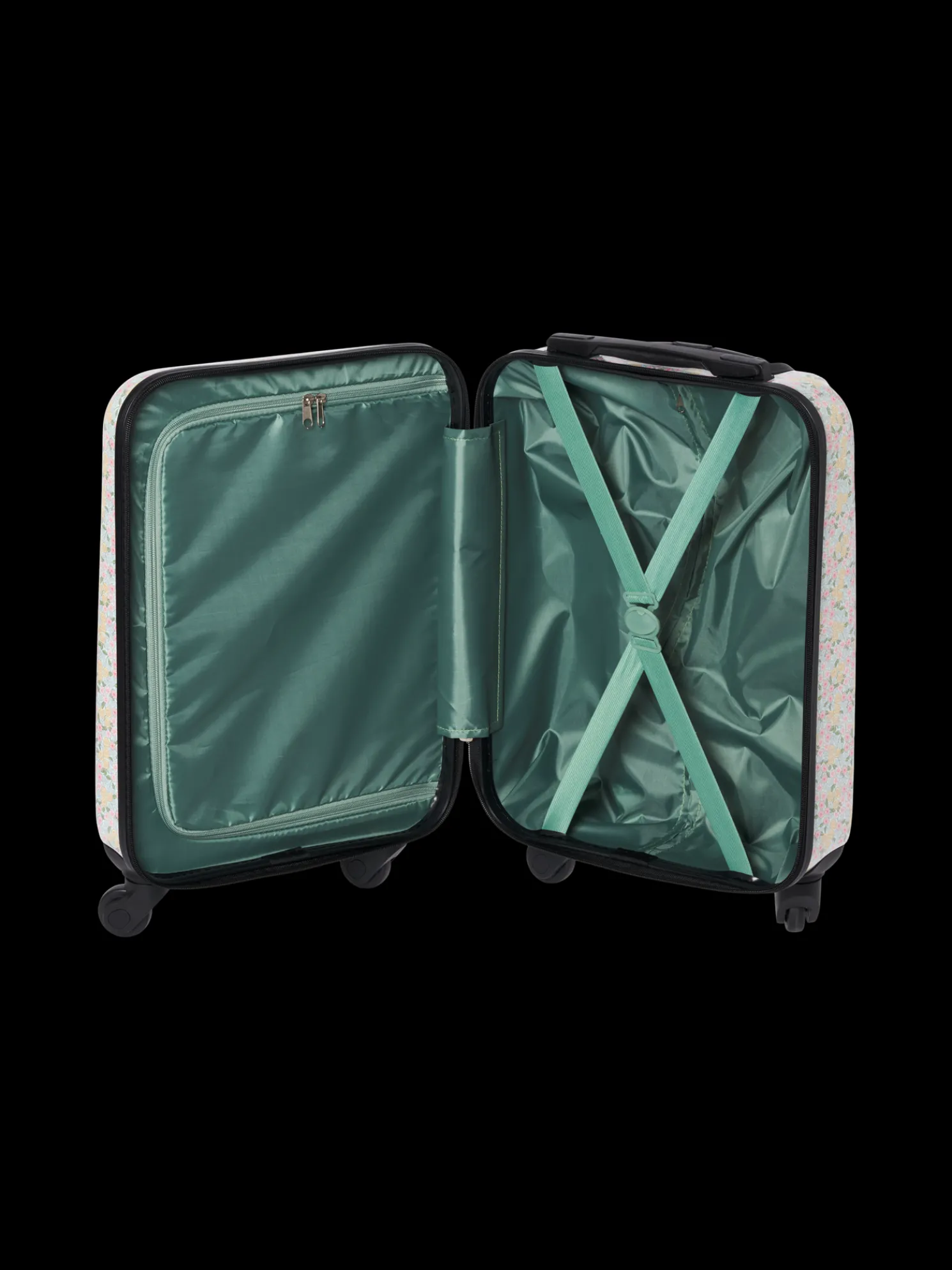 Der Hartschalenkoffer der Schwestern hat vier Rollen und einen Reißverschluss. Er verfügt auch über ein elastisches Band, um Ihre Kleidung auf Reisen an Ort und Stelle zu halten.