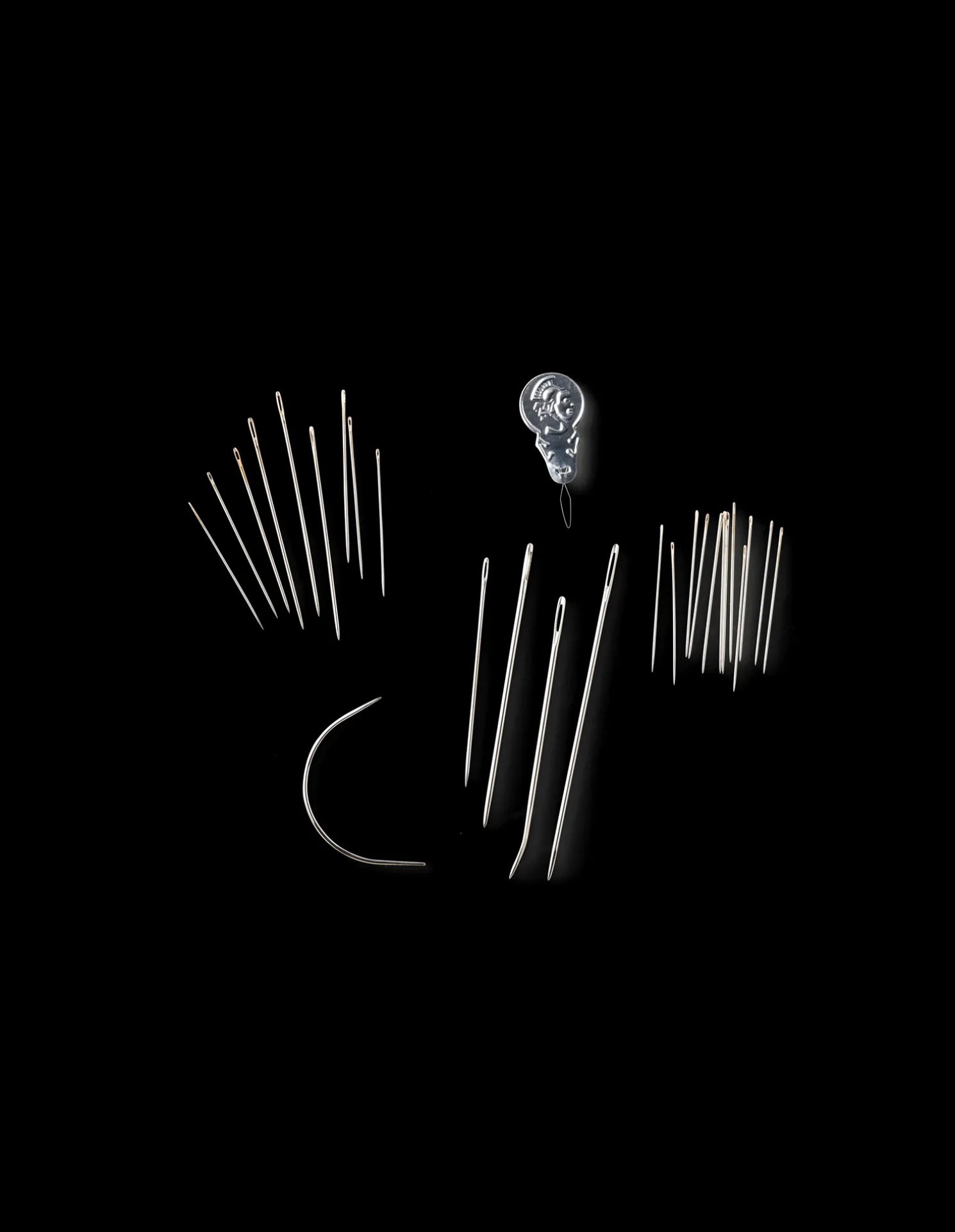 Das Nadelset der Schwestern besteht aus Eisen und enthält 27 Teile: 12 gemischte, goldene Perlennadeln mit großem Nadelöhr, 9 verschiedene Nähnadeln, 1 Teppichnadel, 1 Segelnadel 1 Sacknadel, 1 gerade Polsternadel, 1 gebogene Matratzennadel und 1 Nadeleinfädler. „Umgeben Sie sich mit guten Materialien und den richtigen Utensilien und erleben Sie, wie Ihre Kreativität zu blühen beginnt“, sagt Anna.