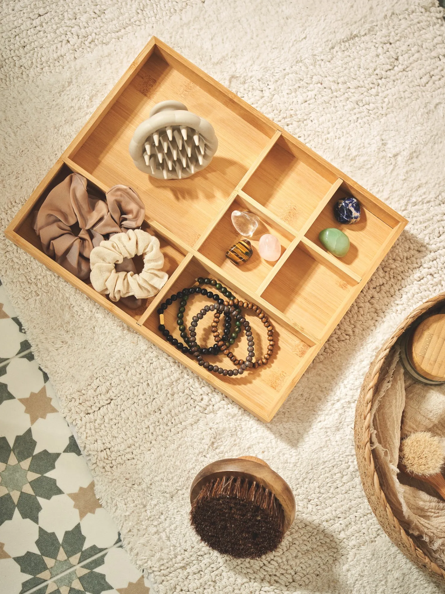 Der Organiser der Schwestern ist aus 100 % FSC®-zertifiziertem Bambus hergestellt und misst 30 x 24 x 3 cm.Halten Sie Ihre Kleinoden mit diesem hübschen kleinen Organiser in Ordnung.