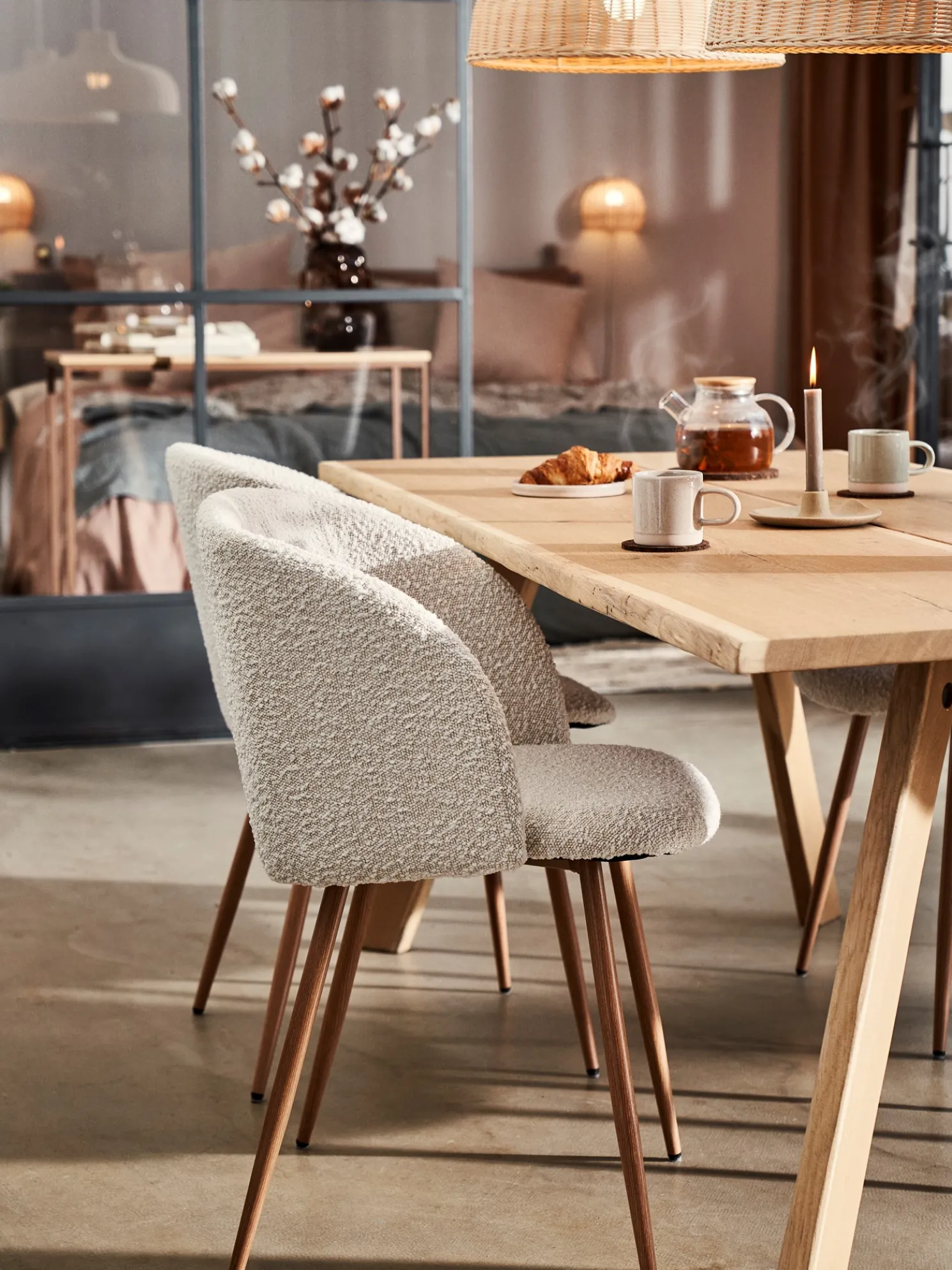 Der Stuhl der Schwestern besteht aus STANDARD 100 by OEKO-TEX®-zertifiziertem* Polyester, Polyurethan und Eisen. Er hat eine Sitzhöhe von 48 cm und eine Sitztiefe von 47 cm.Anna und Clara genießen es, wunderbare Spiele mit Freunden und Familie an ihrem Esstisch zu spielen. „Es ist wichtig, dass man auf einem komfortablen Stuhl sitzt, wenn man einen Spieleabend mit seinen Lieben verbringt“, sagt Anna. Anna und Claras Stuhl mit Bouclé-Stoff sieht am Esstisch zauberhaft aus, funktioniert wunderbar als komfortabler Stuhl im Homeoffice und ist ein hübsches Detail in der Leseecke. Die Kombination der Textur des Stoffes mit den dünnen Metallbeinen verleiht dem Stuhl einen äußerst eleganten Look.*SH040 191228 TESTEX
