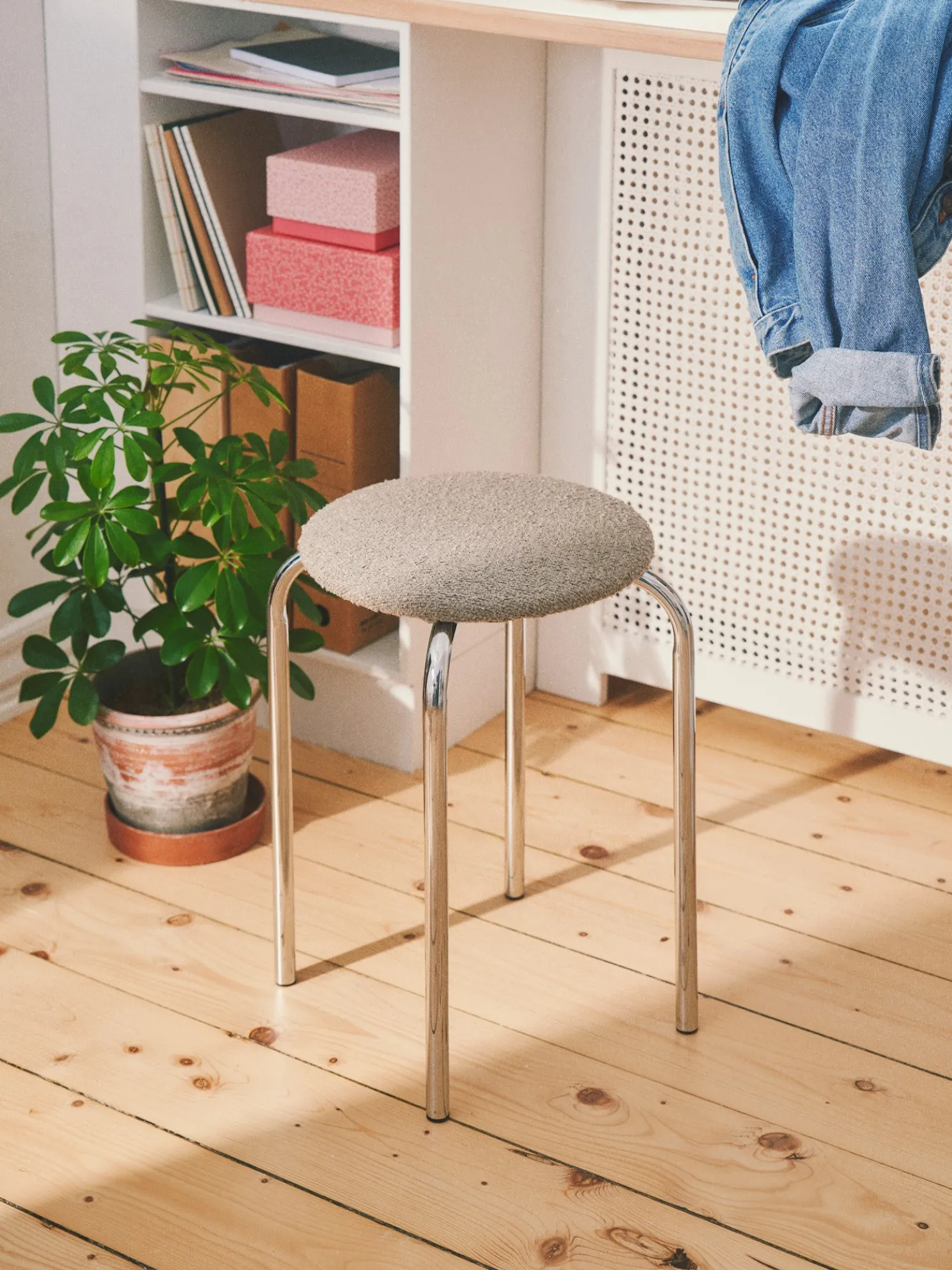 Der Hocker mit Bouclé-Stoff hat eine FSC®-zertifizierte MDF-Basis und kann ein einfacher zusätzlicher Sitzplatz in Ihrem Zuhause sein.