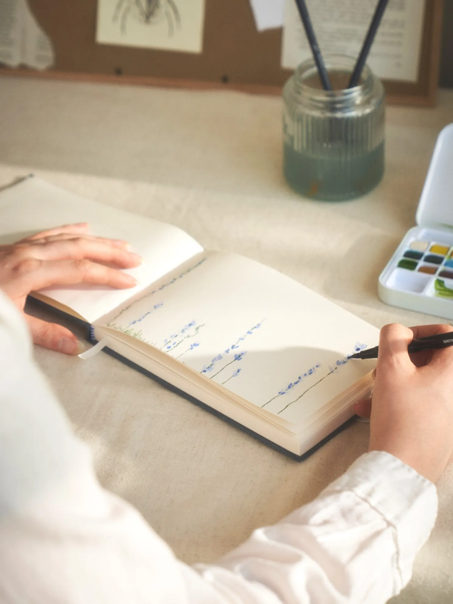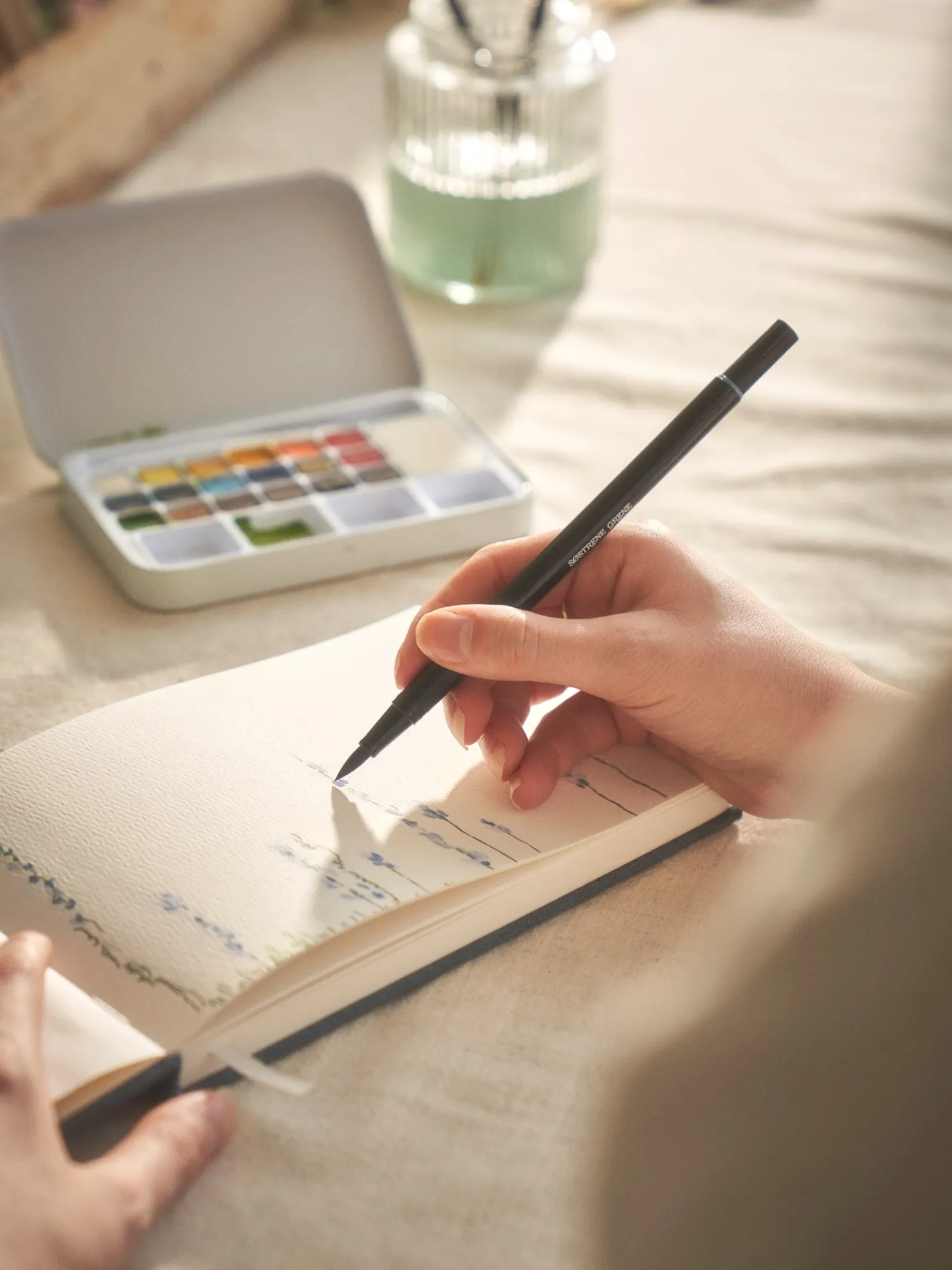 Das Aquarellfarben-Set der Schwestern enthält eine Mischpalette, Brush Pens, einen Wasserpinsel, einen Fineliner, einen Bleistift und ein Radiergummi.