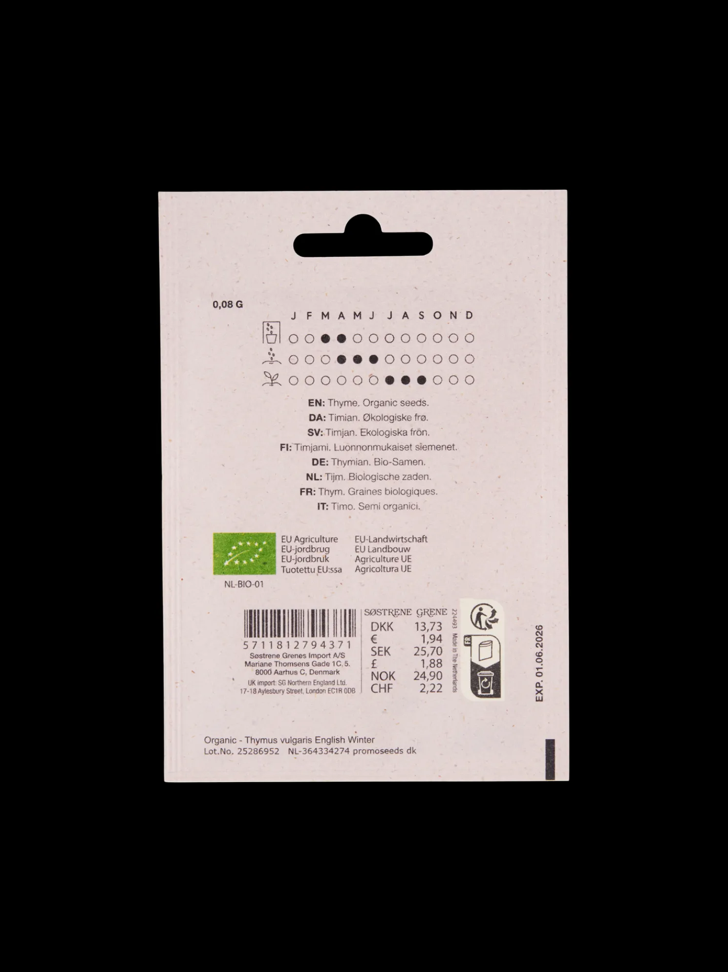 Die Thymiansamen der Schwestern stammen aus biologischem Anbau. In einer Packung befinden sich 0,08 g.Säen Sie die Samen von März bis April drinnen in einem Topf oder säen Sie sie von April bis Juni ins Freie. Optional können die Samen ab April ins Freie umgepflanzt werden.