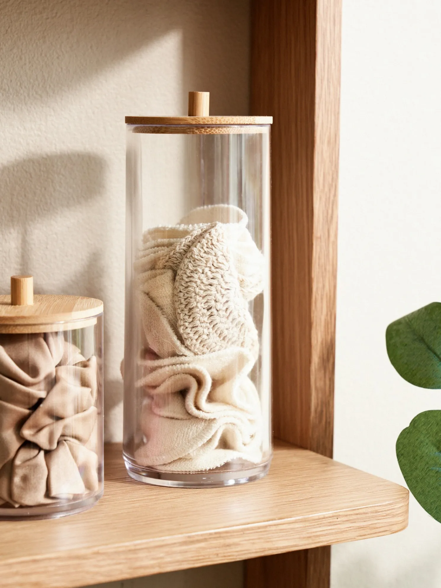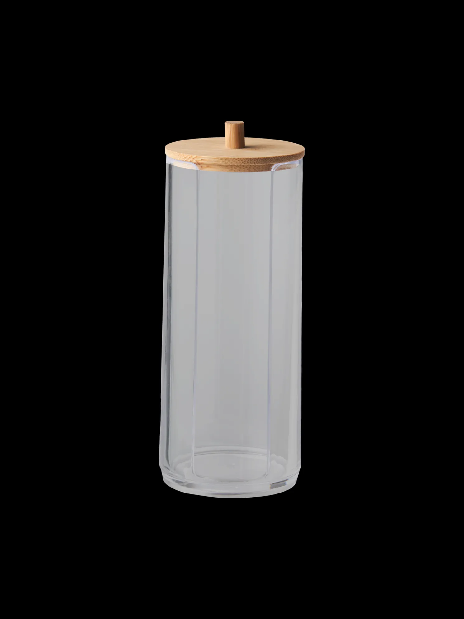 Die Box der Schwestern besteht aus Polystyrol und der Deckel aus 100 % FSC®-zertifiziertem Bambus. Die Box hat einen Durchmesser von 7 cm und misst 20 cm in der Höhe.