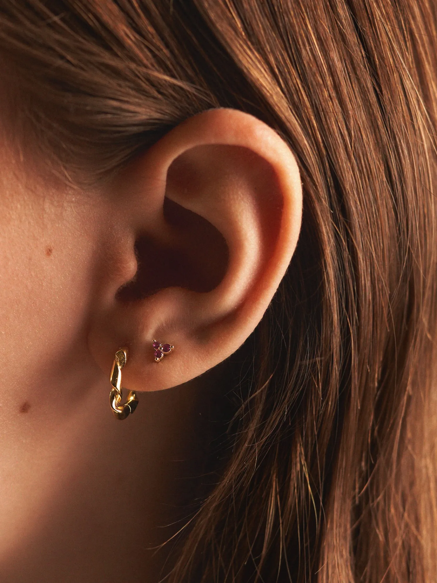 Die Clover-Ohrringe der dänischen Marke AndCopenhagen sind aus 925er Sterlingsilber gefertigt, mit 18 Karat Gold überzogen und mit drei rosa Steinen verziert. Sie sind 4 mm breit und werden in einer schönen kleinen Schmuckschatulle geliefert. Anna und Clara weisen darauf hin, dass Sie den direkten Kontakt mit Feuchtigkeit und Flüssigkeiten vermeiden sollten, um eine bessere Haltbarkeit der Vergoldung zu gewährleisten.