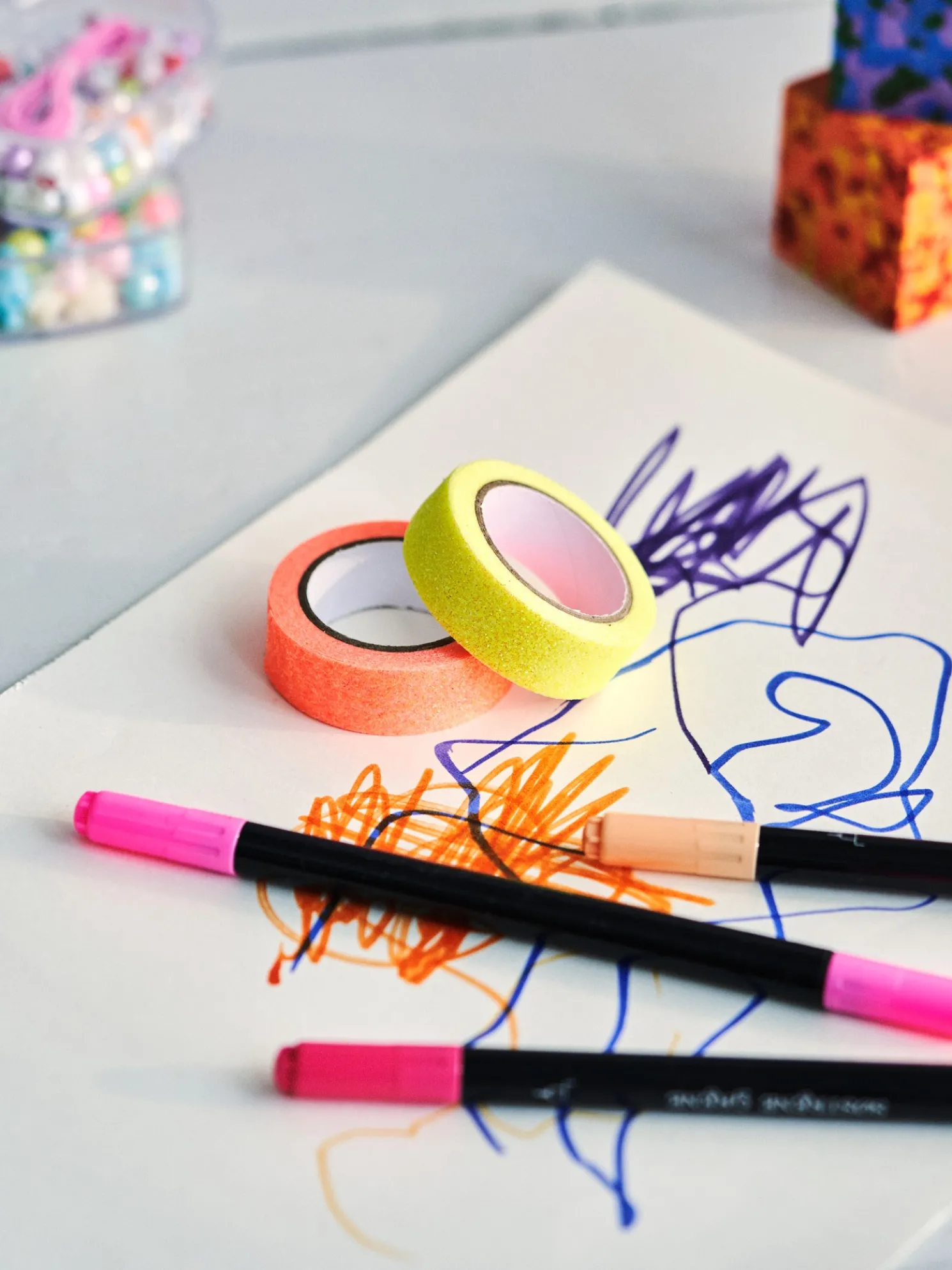Das dekorative Klebeband der Schwestern besteht aus FSC®-zertifiziertem Papier sowie Polypropylen. Eine Packung besteht aus 2 Rollen à 15 mm x 2,4 m in glitzernden Neonfarben.