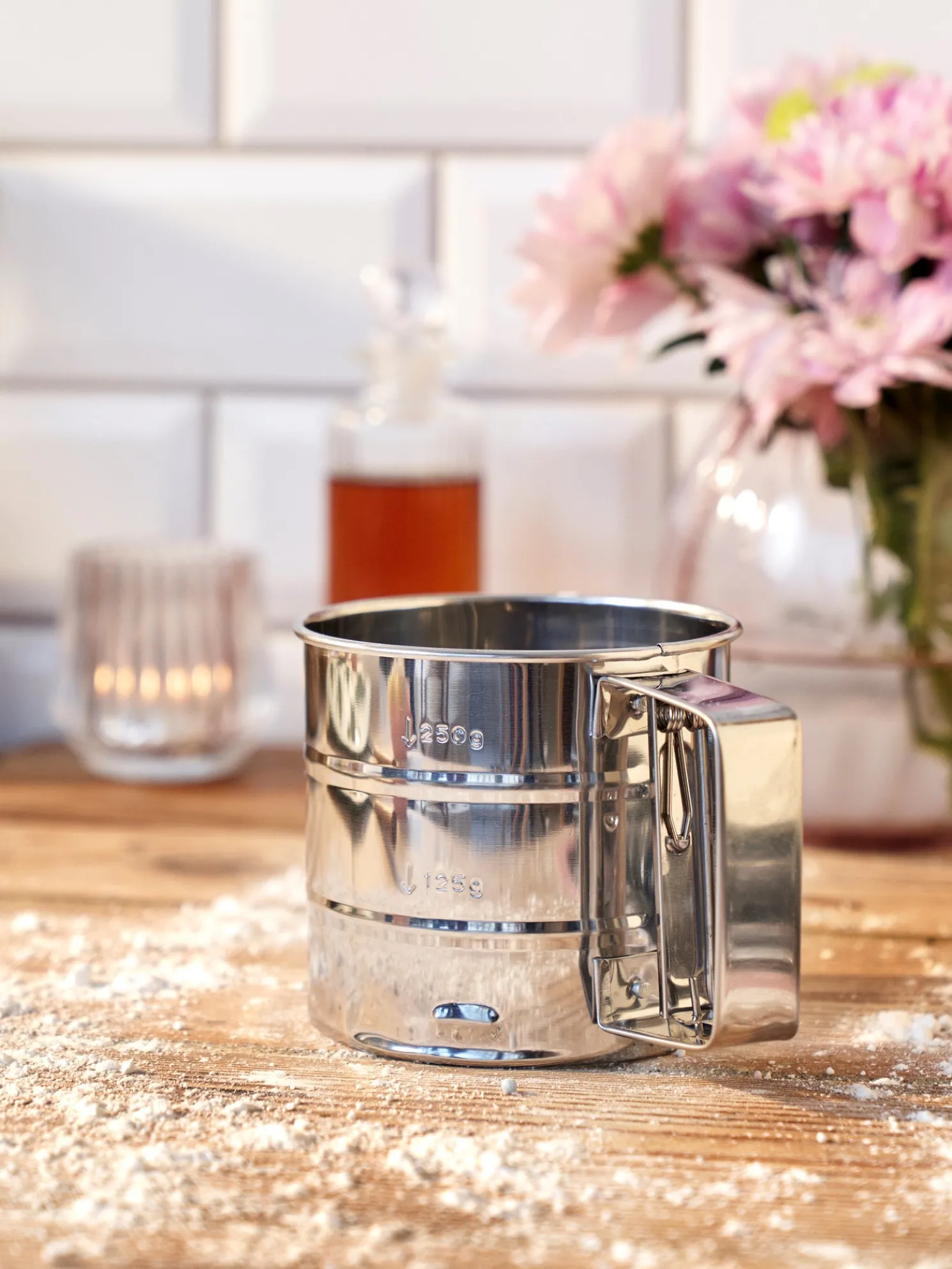 Das Mehlsieb der Schwestern besteht aus Edelstahl und ist eine schöne Ergänzung für jede Küche.