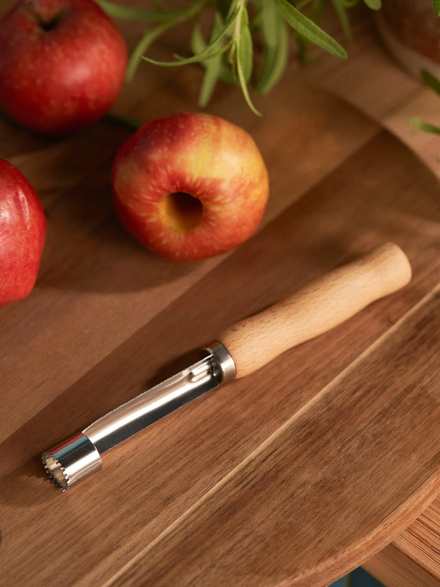 Der Entkerner der Schwestern besteht aus FSC®-zertifiziertem Gummibaumholz und Edelstahl.