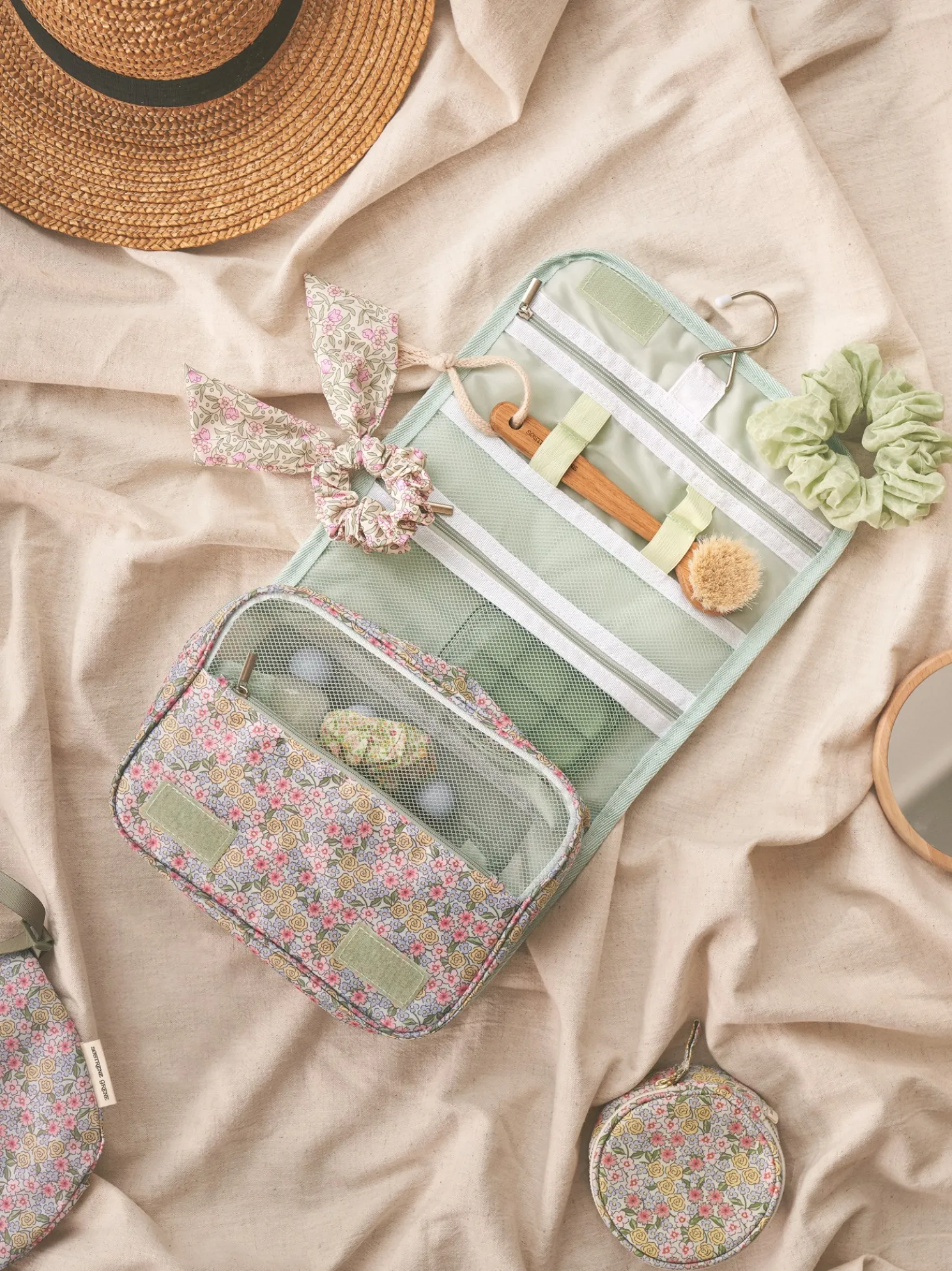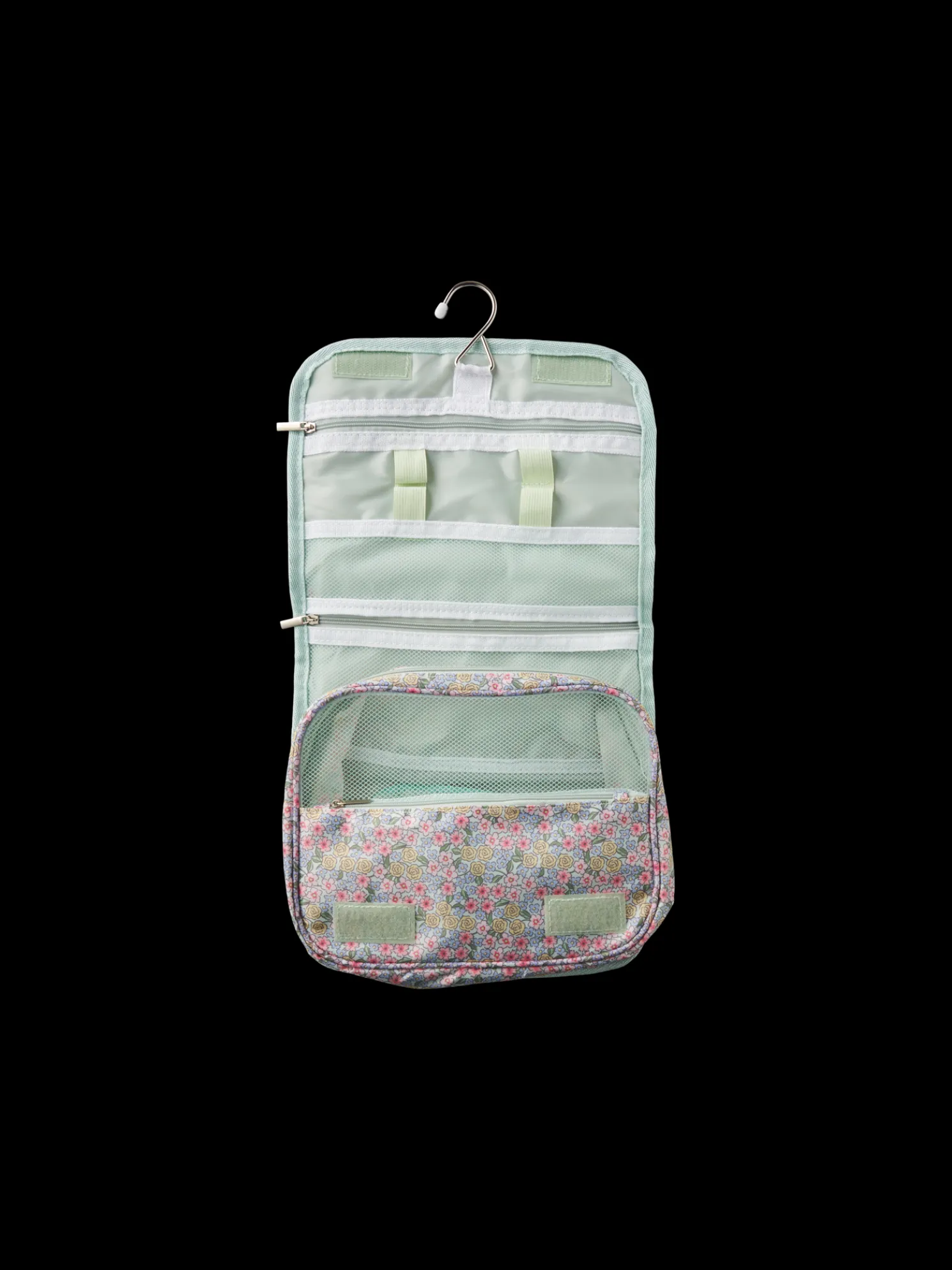 Die Kulturtasche der Schwestern ist STANDARD 100 by OEKO-TEX®-zertifiziert. Sie hat einen praktischen Haken zum Aufhängen und hat elastische Riemen sowie vier Reißverschlusstaschen innen. Aufgehangen hat sie eine Länge von 40 cm.