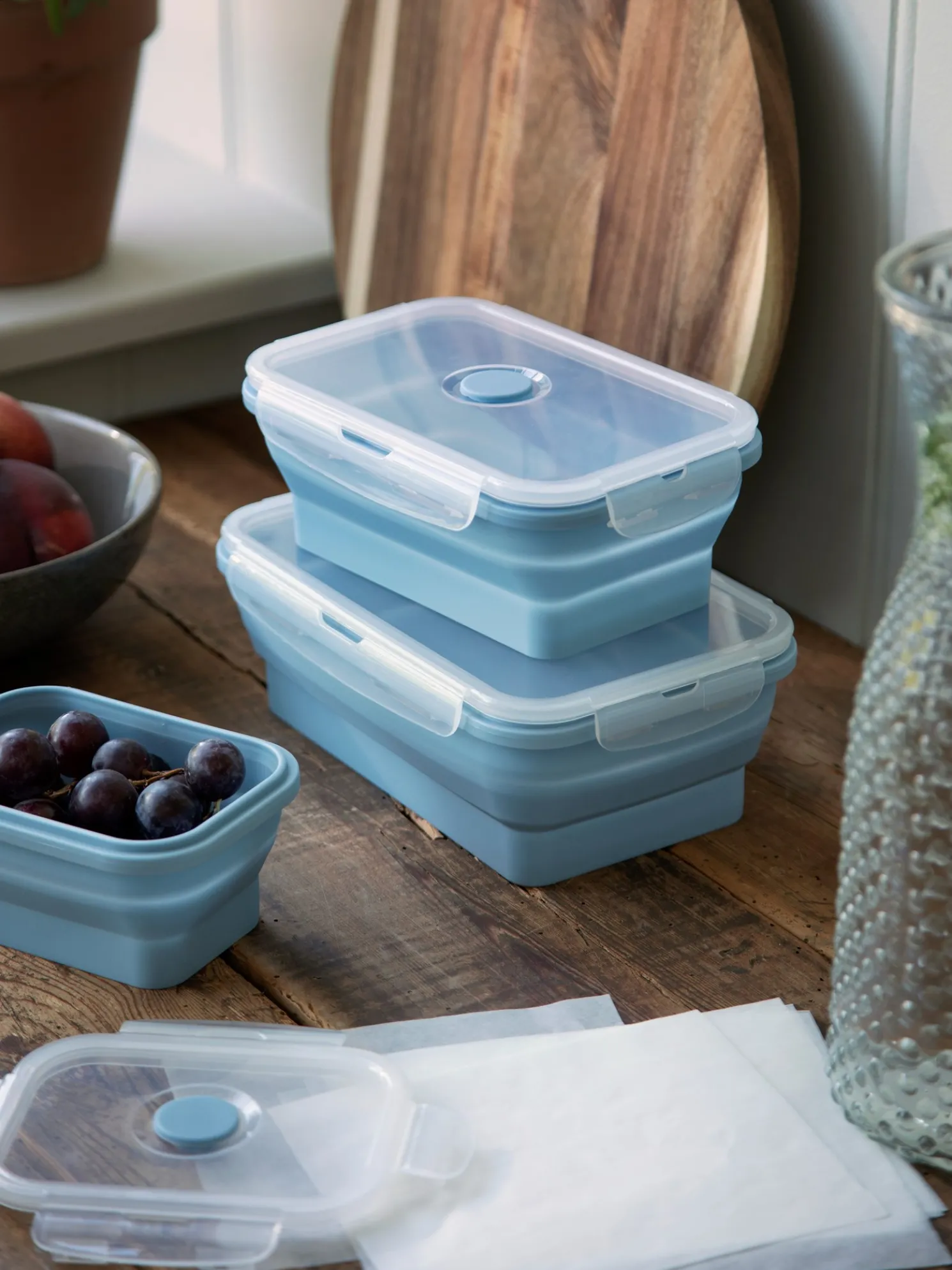Der Lebensmittelbehälter der Schwestern besteht aus Silikon und Polypropylen. Er kann zur einfachen Aufbewahrung zusammengeklappt werden.Der Behälter ist mikrowellen-, spülmaschinen- und gefrierfest. Der Deckel ist jedoch nicht mikrowellengeeignet.