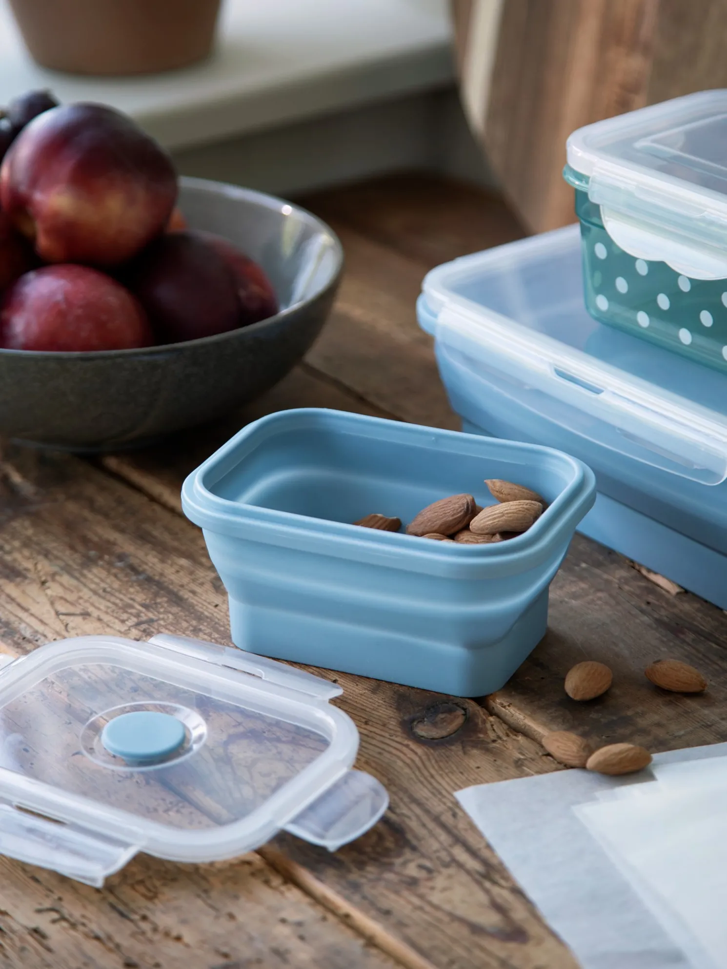 Der Lebensmittelbehälter der Schwestern besteht aus Silikon und Polypropylen. Er kann zur einfachen Aufbewahrung zusammengeklappt werden.Der Behälter ist mikrowellen-, spülmaschinen- und gefrierfest. Der Deckel ist jedoch nicht mikrowellengeeignet.
