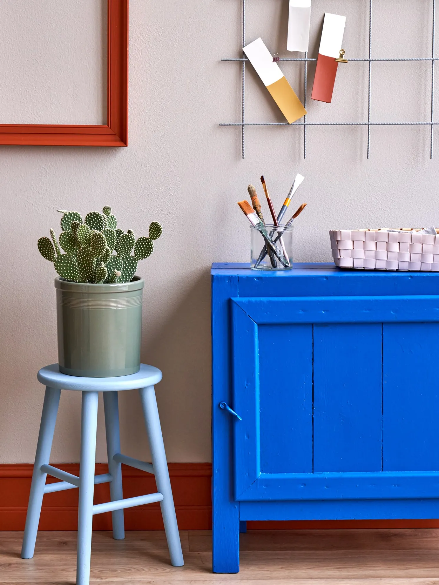 Die Schwestern weisen freundlich darauf hin, dass dieses Produkt nur online erhältlich ist. Die Farbe Almueblå von Color Stories ist eine Acrylfarbe. Sie ist in einem Eimer à 900 ml, der 6-8 m2 deckt. Die Farbe kann auf einer Vielzahl von Oberflächen wie Wänden, Möbeln, Fensterrahmen und vielem mehr verwendet werden. Das Auftragen von zwei dünnen Schichten sorgt für eine ideale Deckkraft. Die Farbe wird in Dänemark hergestellt.„Farbe in Ihr Zuhause zu bringen, ist eine wunderbare Art, Ihrer Einrichtung eine persönliche Note zu verleihen“, freut sich Anna. Gerade hat sie zwei der Esszimmerstühle in den Lieblingsfarben der Schwestern gestrichen und schaut nun entschlossen zur Wand in ihrem Bastelzimmer.„Aber denk dran, alle Oberflächen abzudecken, damit sie nicht so viele Farbspritzer wie dein Gesicht bekommen, liebe Anna“, lacht Clara. „Stimmt“, sagt ihre Schwester. „Und wir müssen auch daran denken, Malerkrepp entlang der Ecken zu befestigen, um saubere Kanten zu haben.“Die Schwestern empfehlen, die Farbe zwischen den Schichten 6-12 Stunden trocknen zu lassen. Sie weisen darauf hin, dass die Farbe nicht mit Malerzubehör geliefert wird und dass die Farbe je nach Bildschirm ein wenig abweichen kann. Eine Anleitung zum Streichen finden Sie auf Anna und Claras Color Stories-Markenseite.