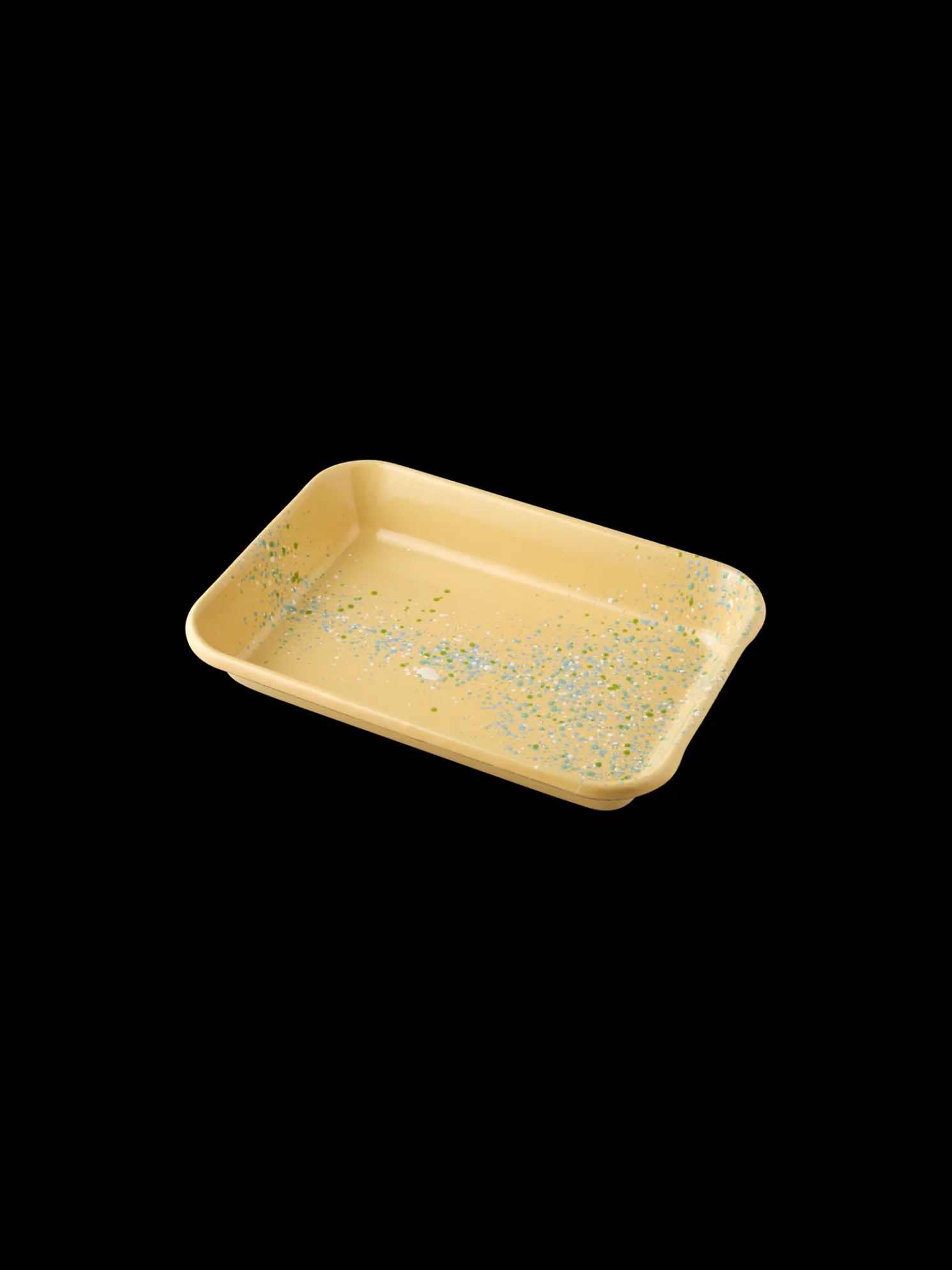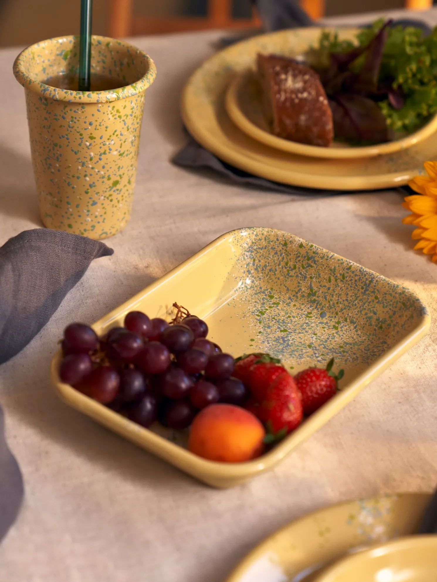 Die Schwestern weisen freundlich darauf hin, dass dieses Produkt nur online erhältlich ist.Das Flow Fest Emaille-Tablett von Kapka misst 27 x 19,5 x 4 cm. Es ist spülmaschinenfest.„Das sieht fast aus wie Konfetti“, ruft der Neffe, während er sich vorbeugt, um eine Handvoll Erdbeeren von dem Tablett zu pflücken, das Anna ausgelegt hat. Die Schwestern haben die Kinder zu einem Picknick in ihren Lieblingspark eingeladen. Der Picknickkorb ist prall gefüllt mit Leckereien, erfrischenden Getränken und praktischem Geschirr.„Diese Art von Geschirr ist unglaublich nützlich für Picknicks, da es leicht und robust ist“, erklärt Clara. „In der Tat, liebe Schwester. Aber es sieht auch wunderbar hübsch auf einem schön gedeckten Tisch zu Hause aus“, fügt Anna mit einem Lächeln hinzu.
