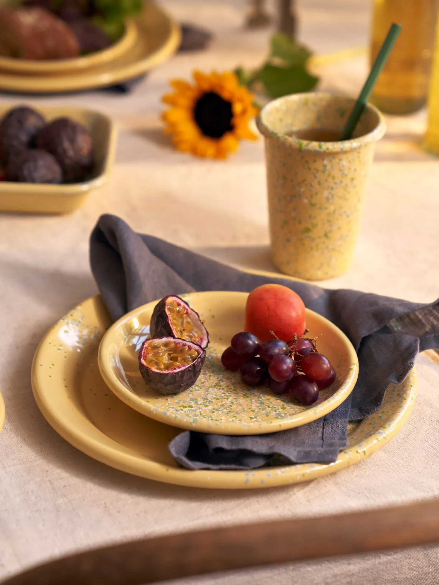 Die Schwestern weisen freundlich darauf hin, dass dieses Produkt nur online erhältlich ist.Der Flow Fest Emailleteller von Kapka hat einen Durchmesser von 17,5 cm. Er ist spülmaschinenfest.„Das sieht fast aus wie Konfetti“, ruft der Neffe, während er löffelweise einen leckeren Sommersalat auf seinen Teller häuft. Die Schwestern haben die Kinder zu einem Picknick in ihren Lieblingspark eingeladen. Der Picknickkorb ist prall gefüllt mit Leckereien, erfrischenden Getränken und praktischem Geschirr.„Diese Art von Geschirr ist unglaublich nützlich für Picknicks, da es leicht und robust ist“, erklärt Clara. „In der Tat, liebe Schwester. Aber es sieht auch wunderbar hübsch auf einem schön gedeckten Tisch zu Hause aus“, fügt Anna mit einem Lächeln hinzu.