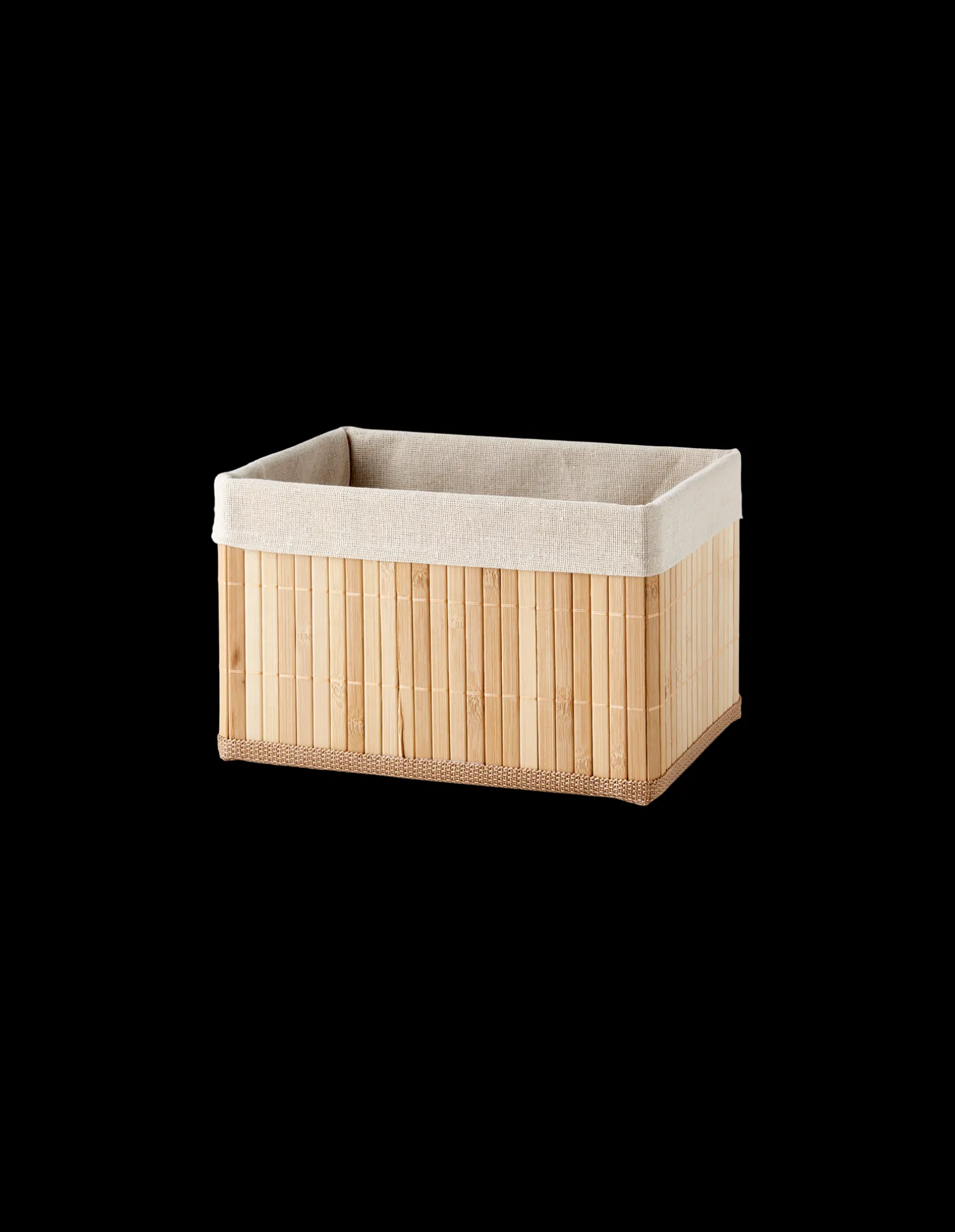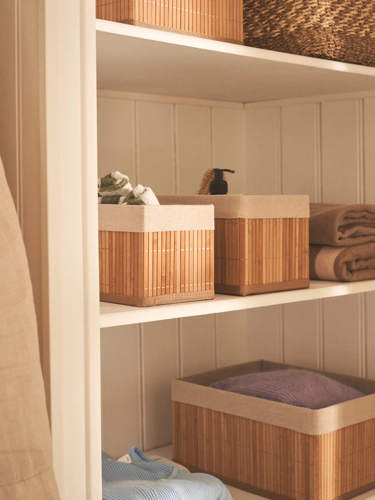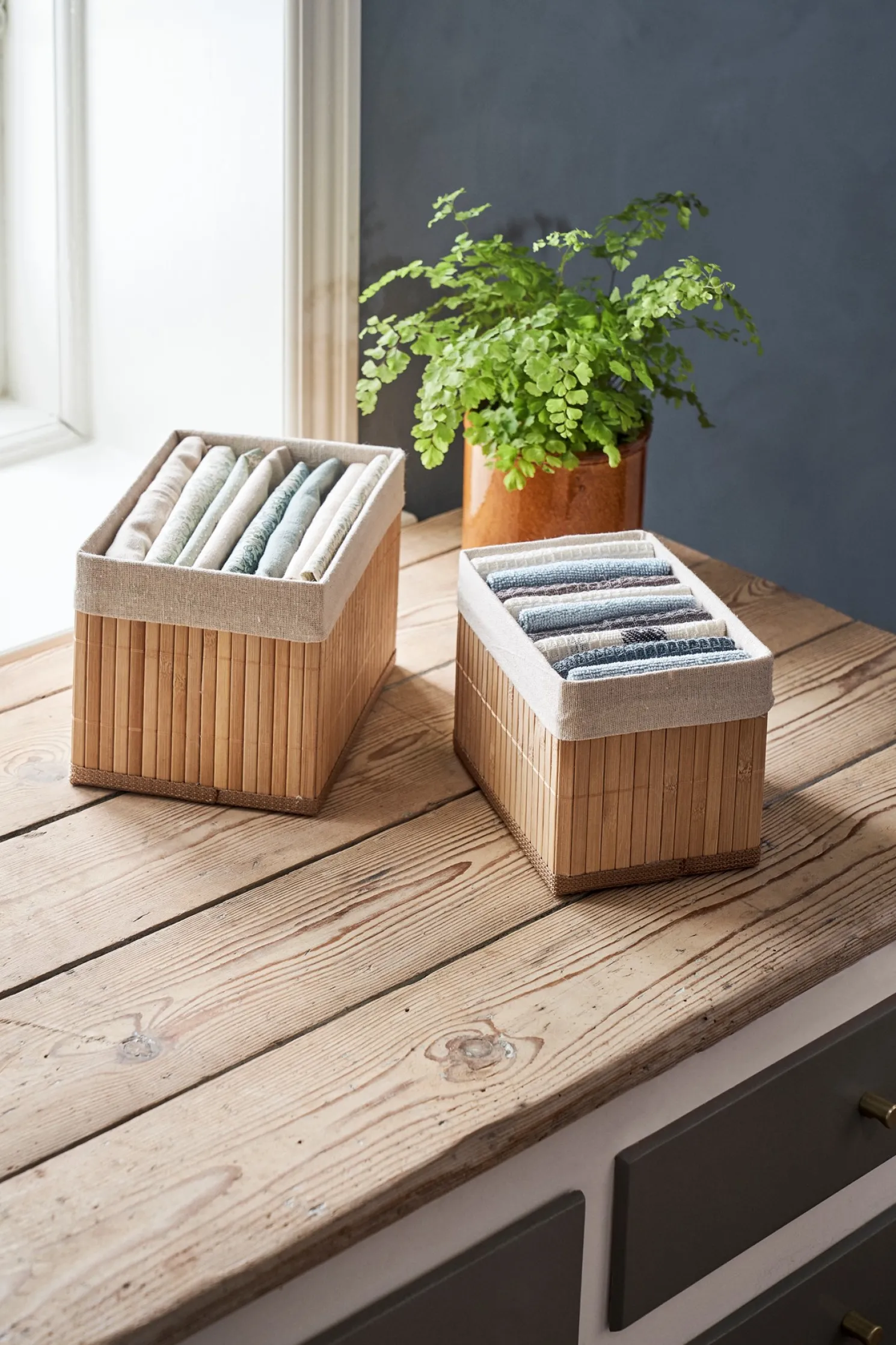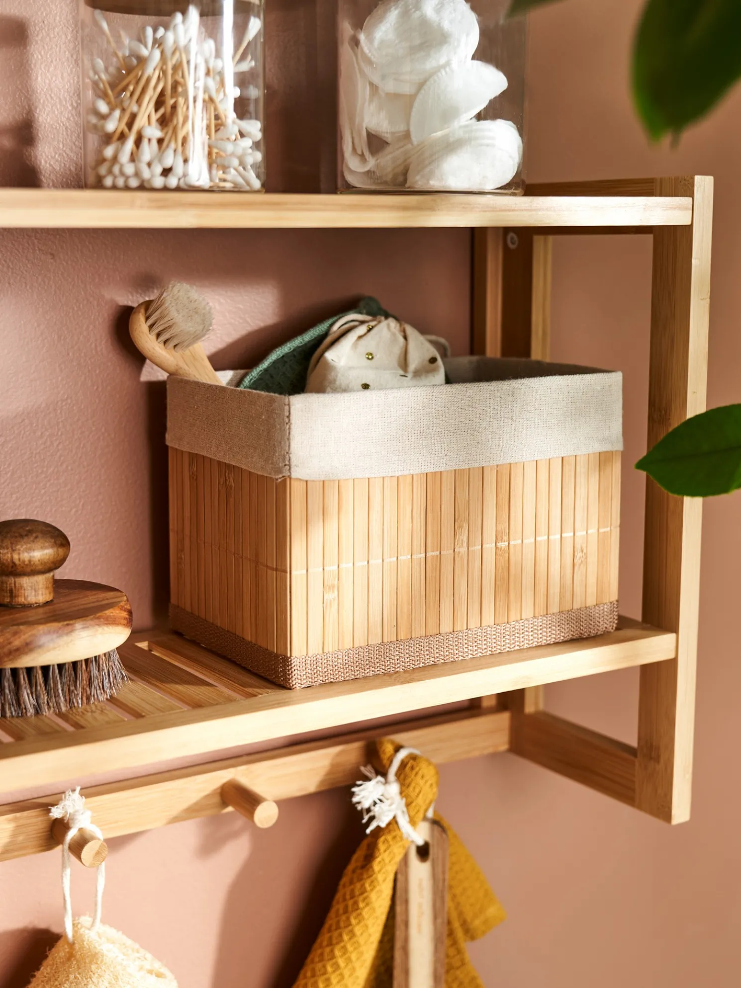 Der Aufbewahrungskorb der Schwestern besteht aus 100 % FSC®-zertifiziertem Bambus und hat ein Futter aus 60 % Polyester und 40 % Baumwolle. Er misst 24 x 17 x 16 cm.Da es sich bei Bambus um ein natürliches Material handelt, weisen die Schwestern darauf hin, dass das Produkt in Farbe und Muster leicht variieren kann.