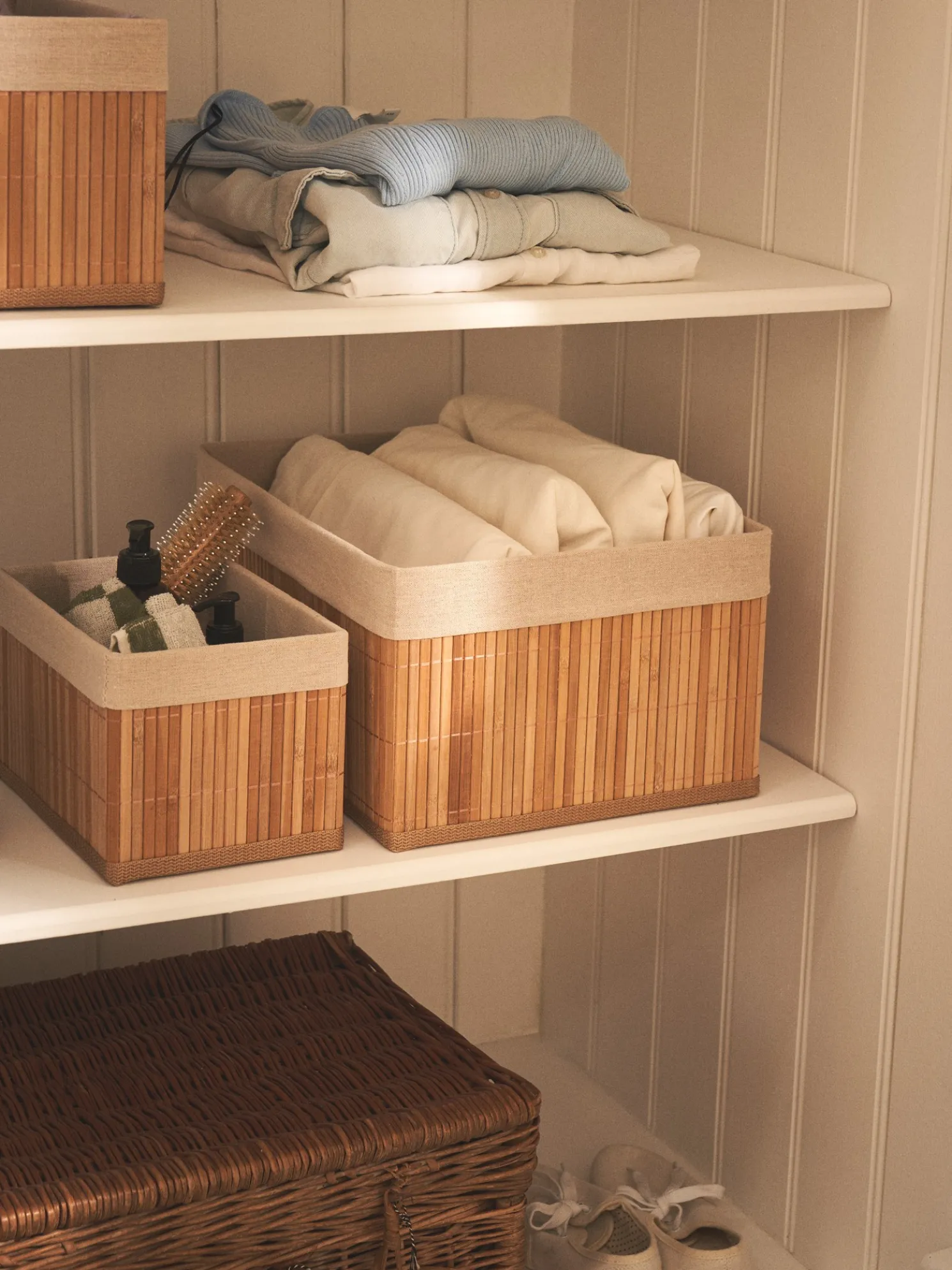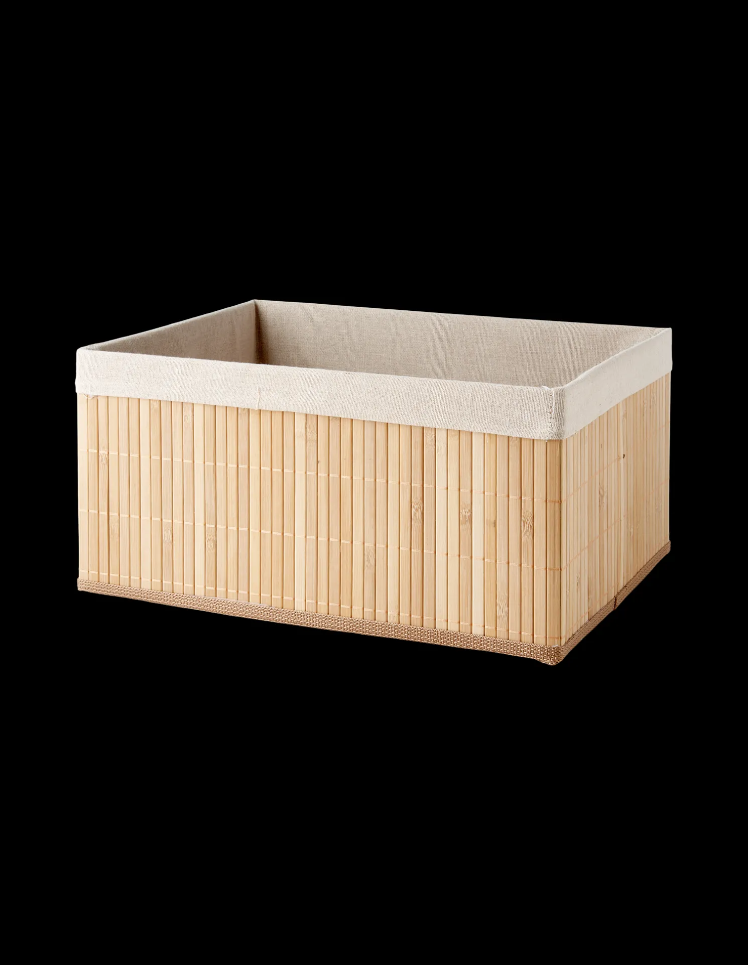 Der Aufbewahrungskorb der Schwestern besteht aus 100 % FSC®-zertifiziertem Bambus und hat ein Futter aus 60 % Polyester und 40 % Baumwolle. Er misst 40 x 30 x 20 cm.Da es sich bei Bambus um ein natürliches Material handelt, weisen die Schwestern darauf hin, dass das Produkt in Farbe und Muster leicht variieren kann.