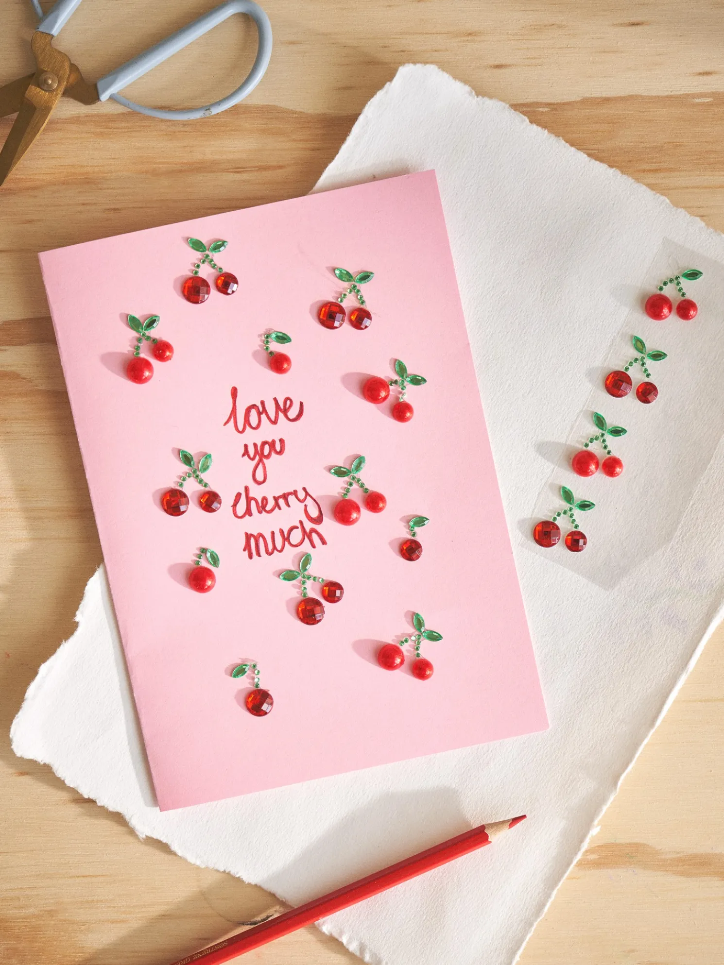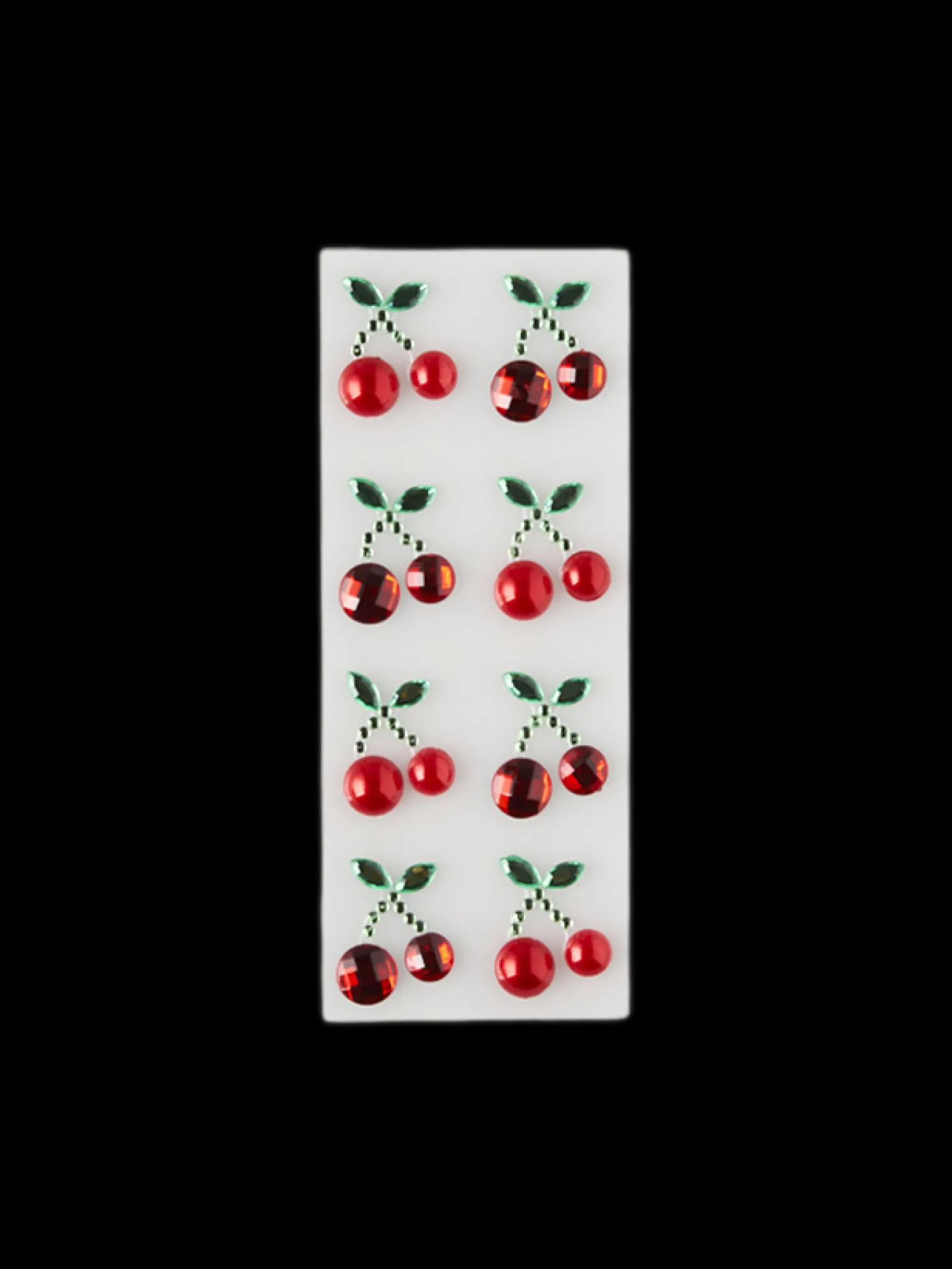 Die Glitzersteinaufkleber der Schwestern bestehen aus Polyresin und PET. Eine Packung enthält 8 kirschförmige Sticker.