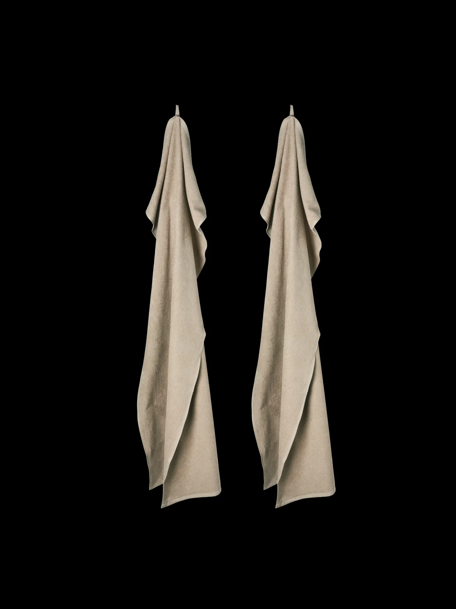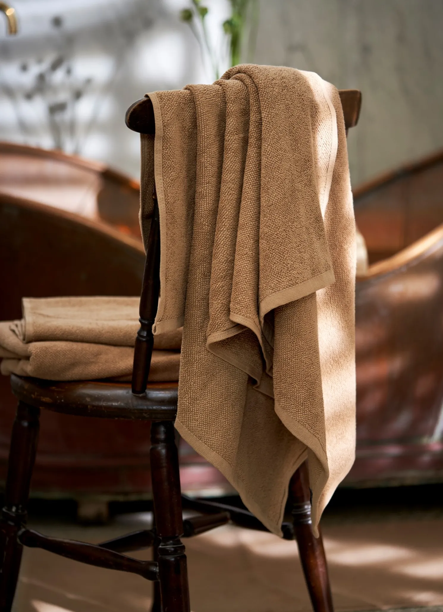 Anna und Claras Handtücher sind aus Baumwolle gefertigt und messen 140 x 70 cm. Clara schmückt ihr Badezimmer mit einer Duftkerze, einer kleinen Pflanze und ihren neuen, weichen Handtüchern. „Weiche Materialien schaffen ein Gefühl von Alltagsluxus“, sagt sie.