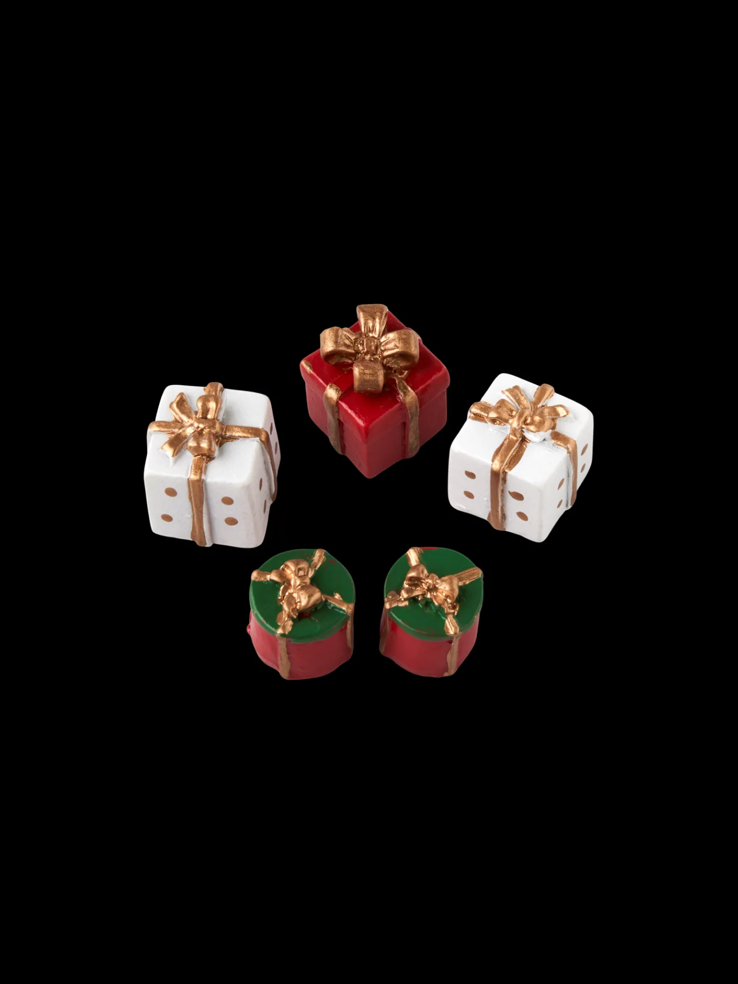 Das Deko-Geschenkset der Schwestern umfasst insgesamt 5 Stück. 1 rotes Geschenk misst 1,7 x 2,2 cm, 2 weiße Geschenke 1,7 x 2,3 cm und 2 runde, rote Geschenke mit einem Durchmesser von 1,5 cm.