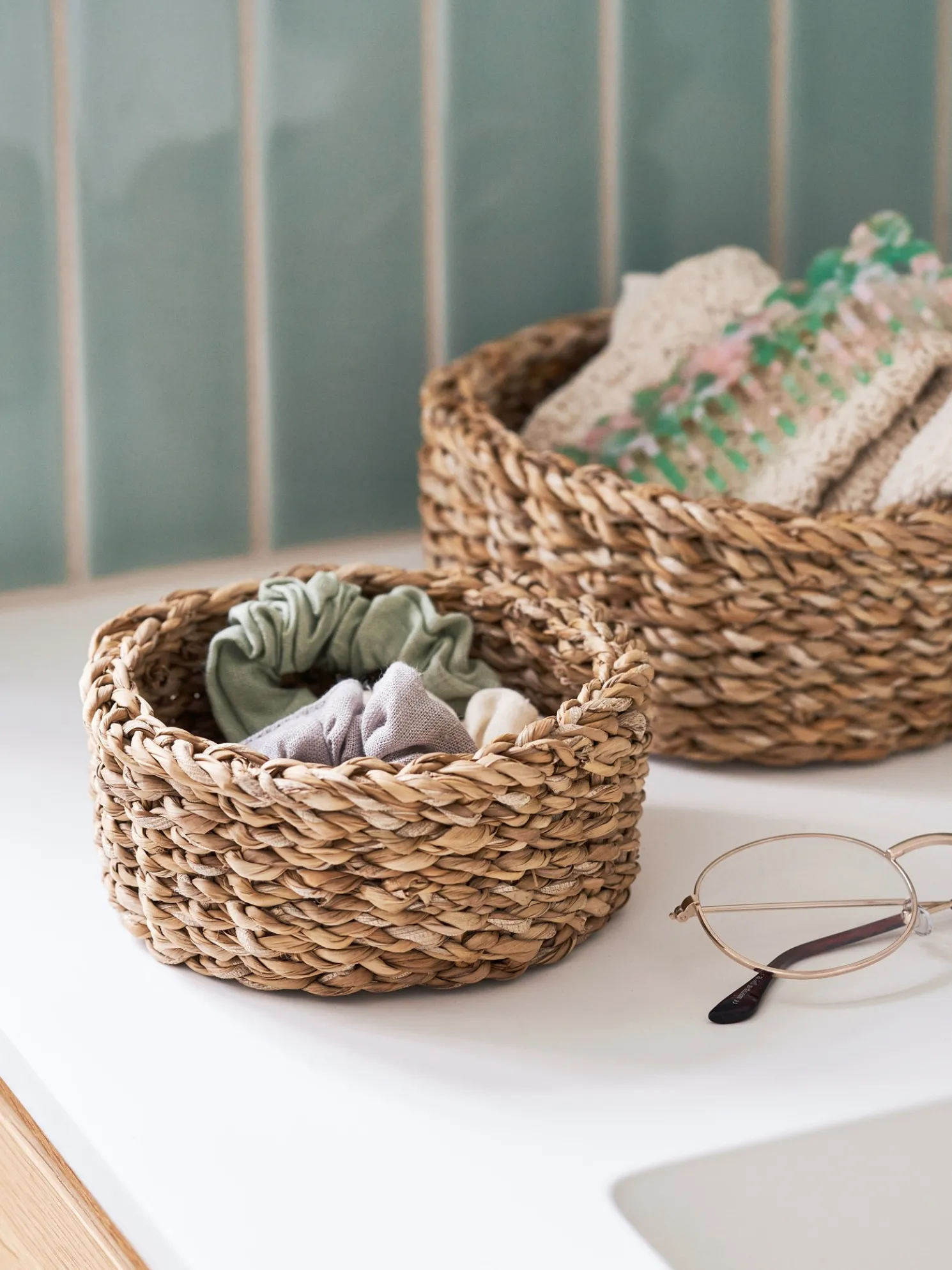 Der runde Korb der Schwestern ist aus Seegras gefertigt und misst 17 x 7 cm.Ein wunderbarer Korb aus natürlichen Materialien, der hervorragend in jede Einrichtung passt.