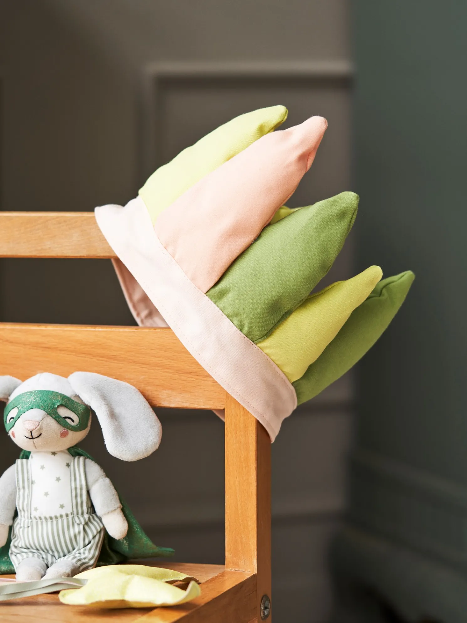 Die Federkrone der Schwestern besteht aus Baumwolle und Polypropylen. Sie hat einen Durchmesser von 15 cm, kann aber mit einem Klettverschluss verstellt werden.„Eine Spielecke regt Kinder und Junggebliebene zu fantasievollen Spielen an“, erzählt Clara. Sie hat eine Ecke des Kinderzimmers mit allerlei Spielzeug und Spielen sowie tollen Kostümen und Zubehör gefüllt.Erleben Sie mit den Kleinen wunderbare und fantastische Abenteuer, indem Sie sich mit tollen Kostümen verkleiden.