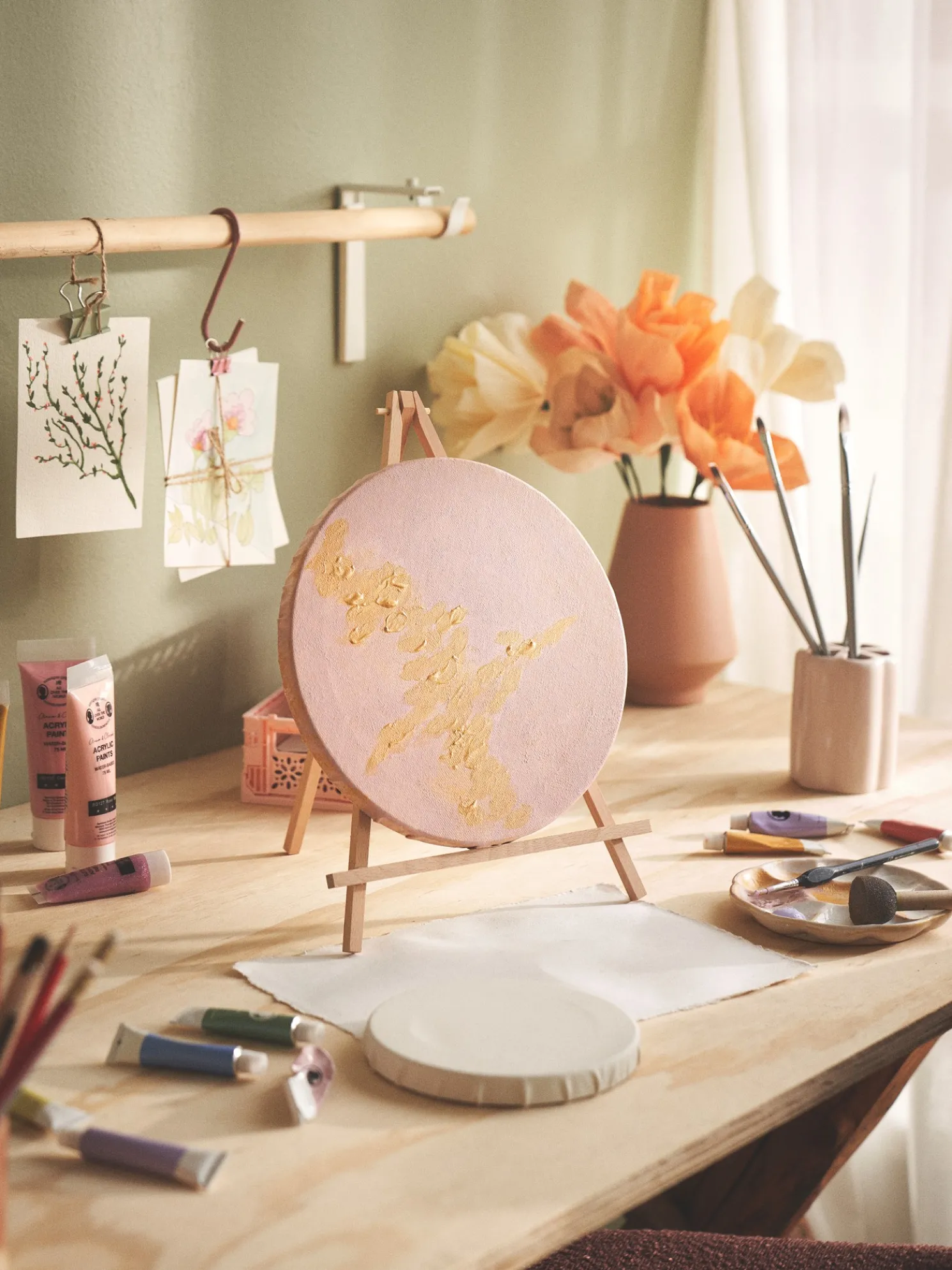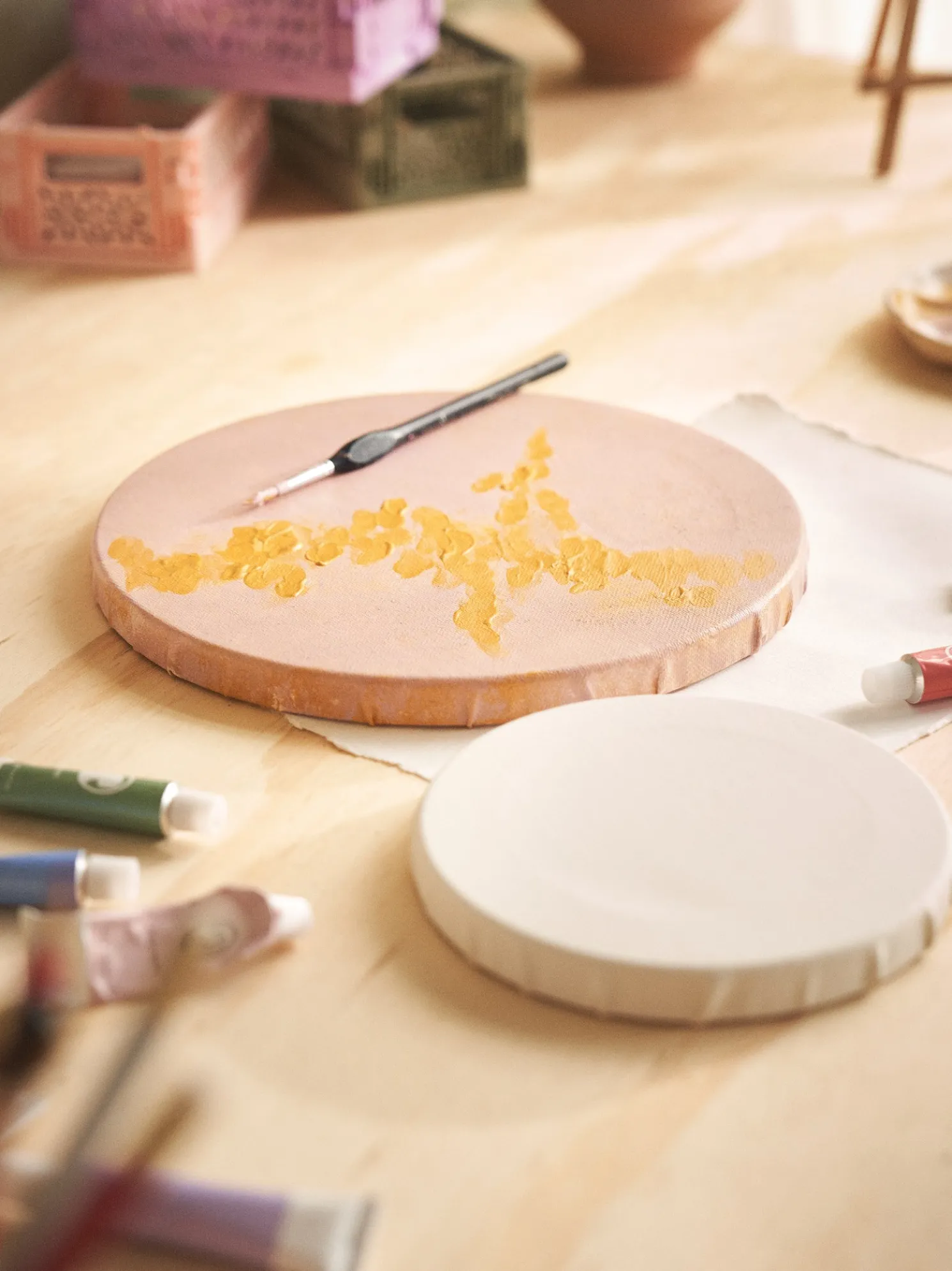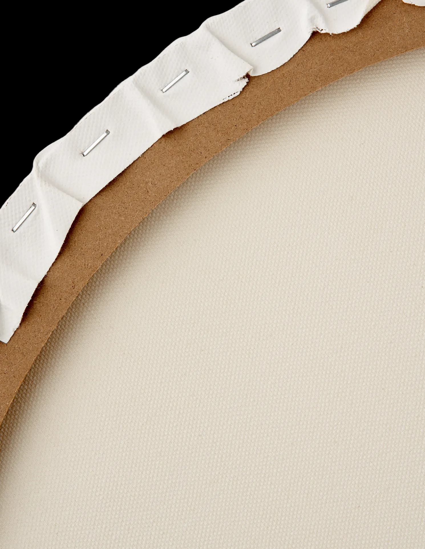 Die Leinwand der Schwestern besteht aus Baumwolle und FSC®-zertifiziertem MDF. Sie ist rund und hat einen Durchmesser von 25 cm.
