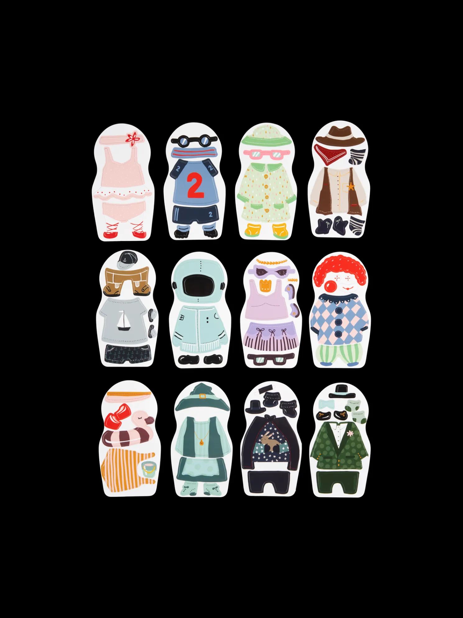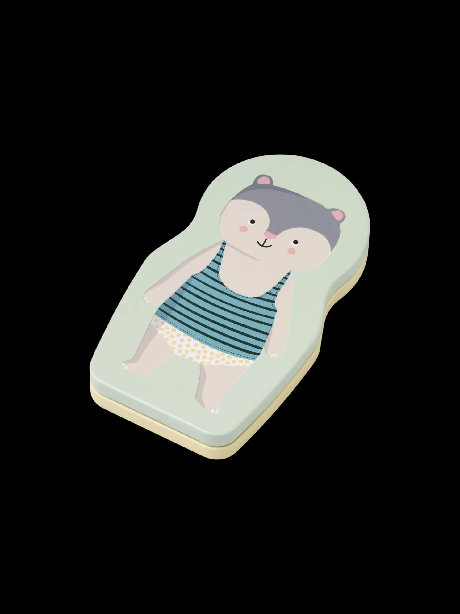 Die magnetische Ankleidepuppe der Schwestern wird in einer Schachtel aus Eisen und Blech geliefert. Im Inneren stehen 12 verschiedene Outfits zur Auswahl.