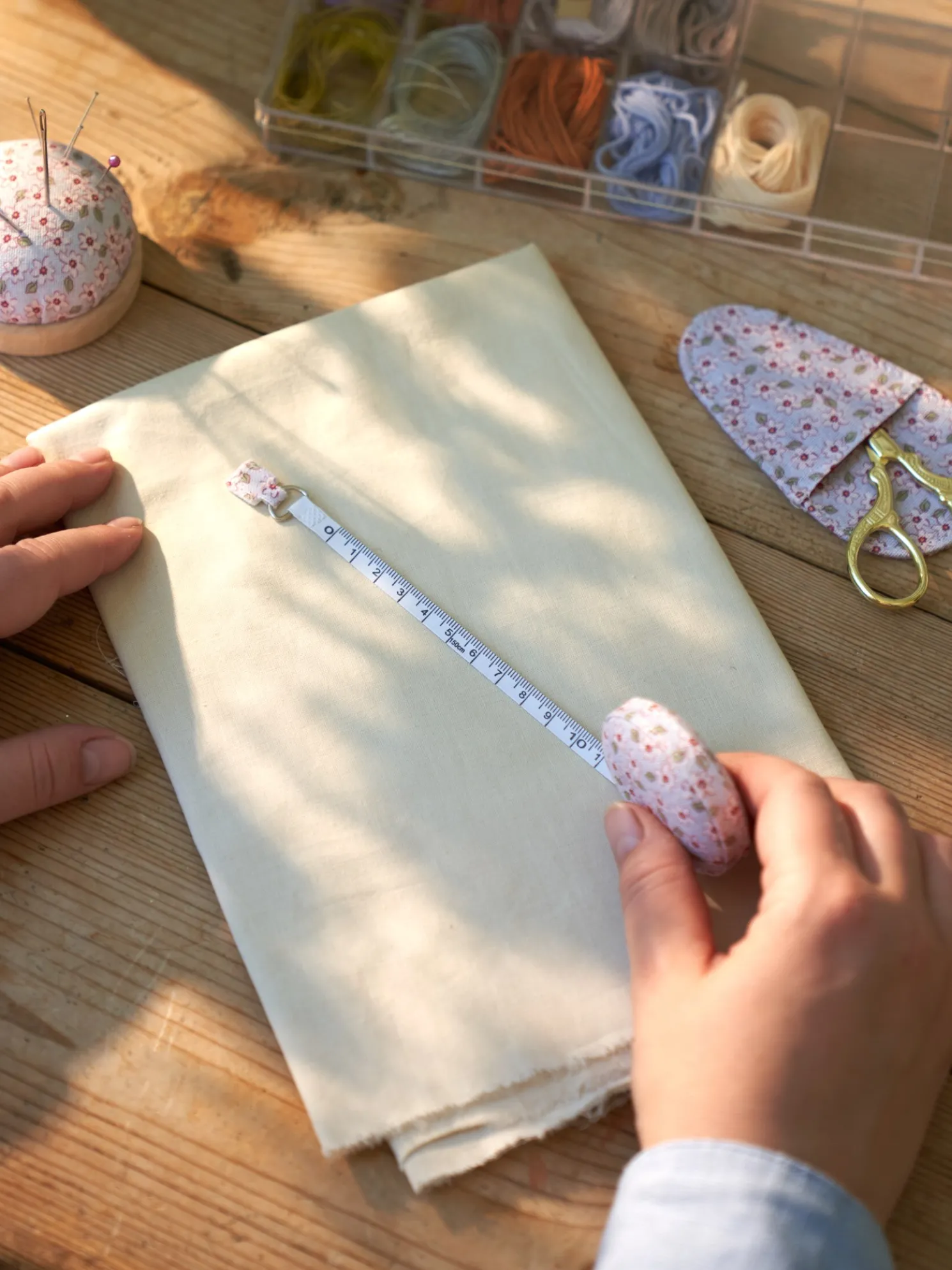 Das Maßband der Schwestern wird in einem hübschen Baumwolletui geliefert, damit Sie es problemlos auf Reisen mitnehmen können. Das Maßband ist 150 cm lang.