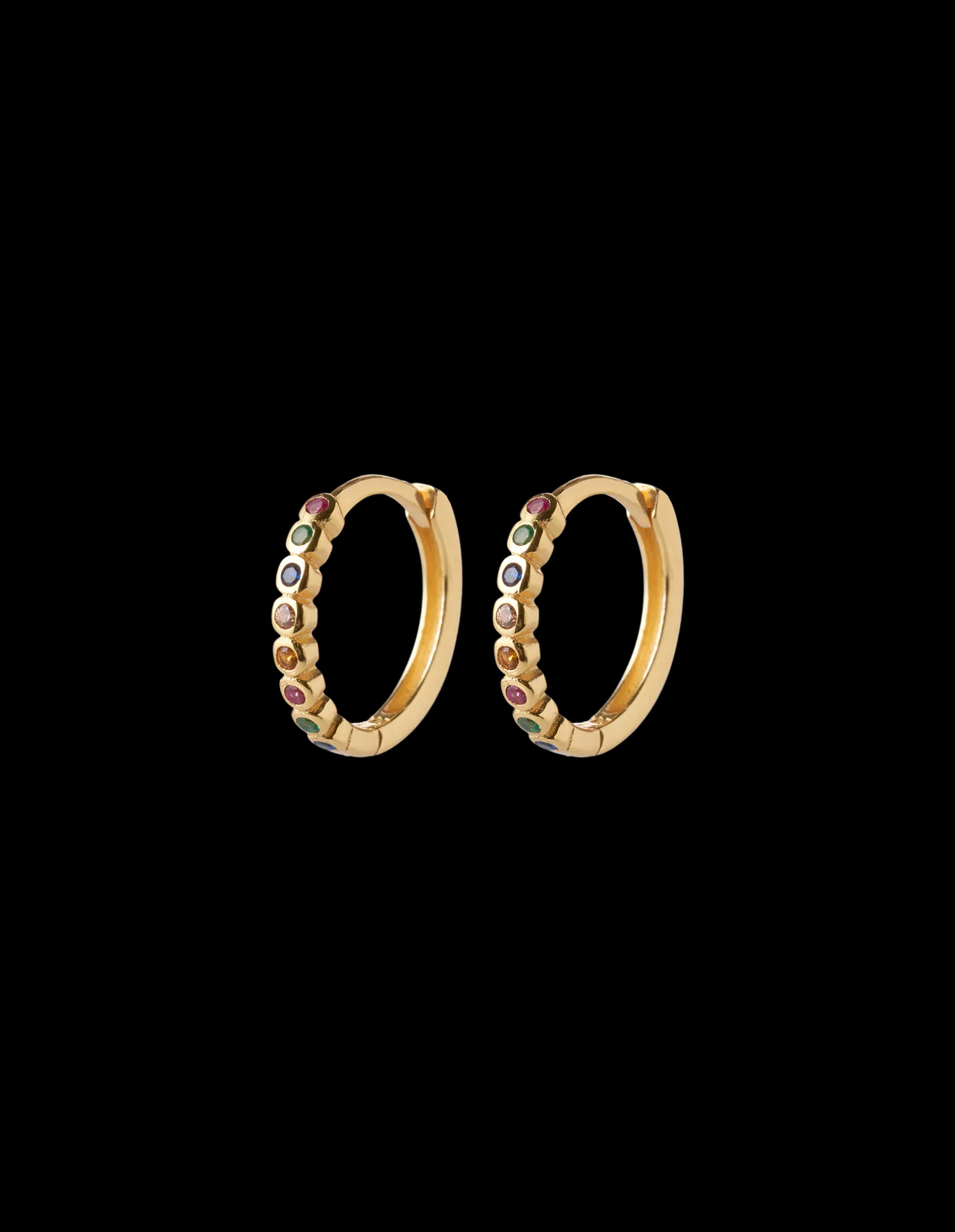 Die Schwestern weisen darauf hin, dass dieses Produkt nur online erhältlich ist.Die Multi Colour Creolen sind aus 925 Sterlingsilber gefertigt und mit 18 Karat Gold plattiert. Die beiden Creolen messen 1,3 cm im Durchmesser und werden in einem schönen, kleinen Schmuckkästchen geliefert.„Eine neue Variante der klassischen Creolen“, sagt Anna mit einem Lächeln. „Sie sind mit kubischen Zirkonias verziert für ein bisschen zusätzliche Eleganz.“Anna und Clara weisen darauf hin, dass Sie den direkten Kontakt mit Feuchtigkeit und Flüssigkeiten vermeiden sollten, um eine bessere Haltbarkeit der Vergoldung zu gewährleisten.