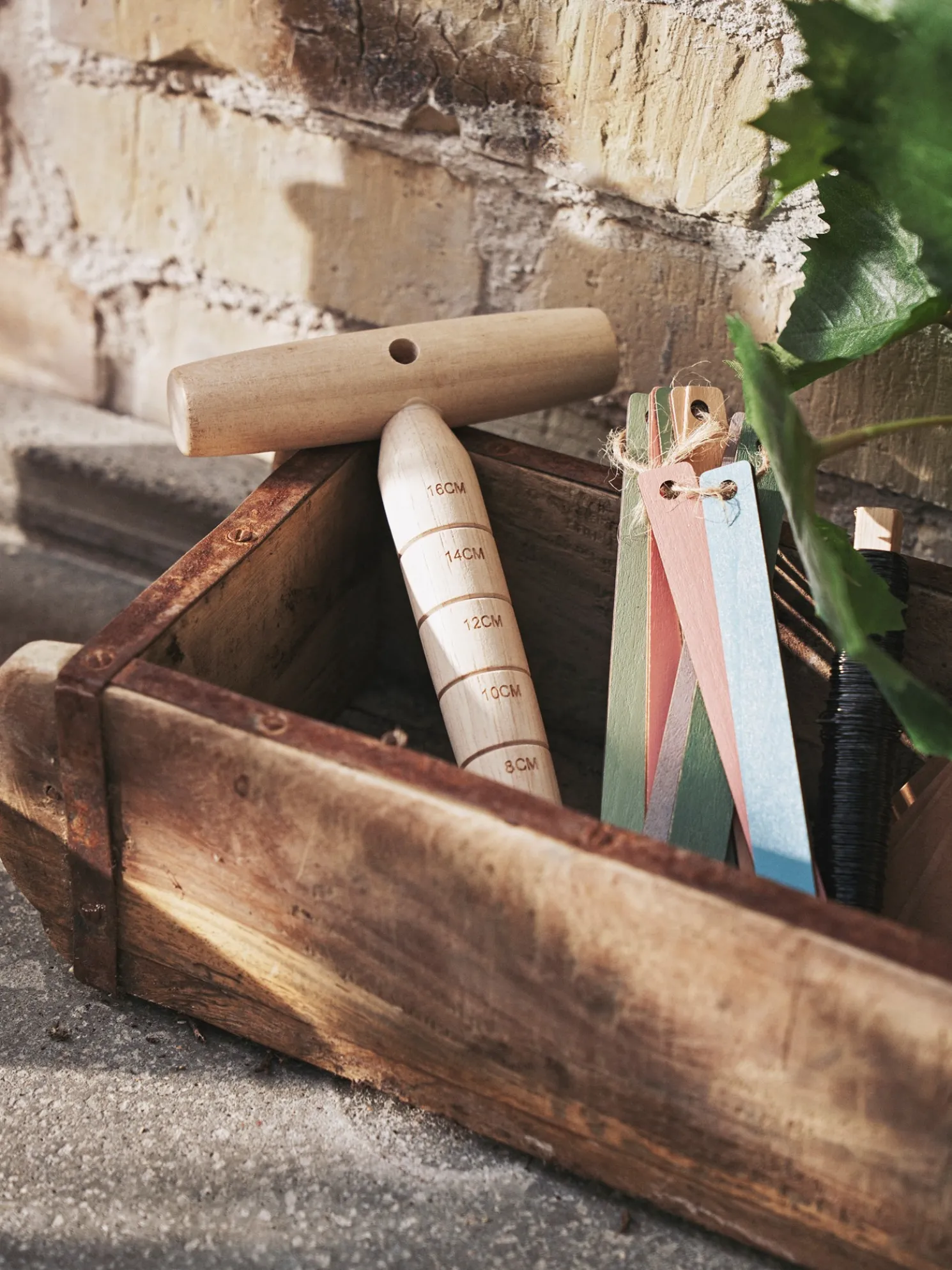 Der Saatlochmacher der Schwestern besteht aus Gummiholz und ist ein praktisches Werkzeug, mit dem Sie Löcher in den Boden bohren können, um Zwiebeln oder Samen zu pflanzen.