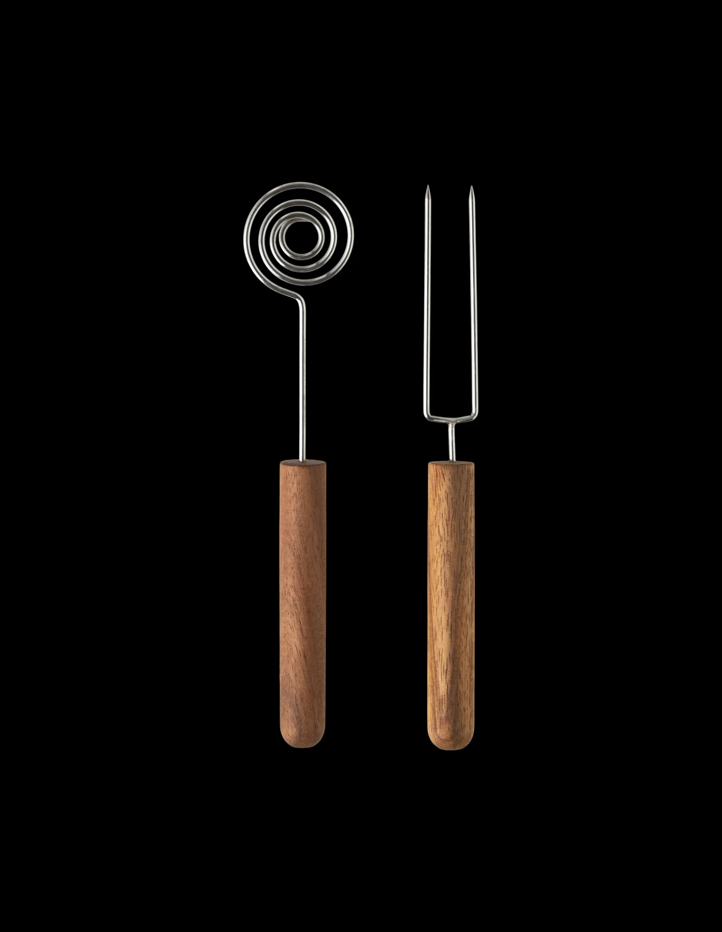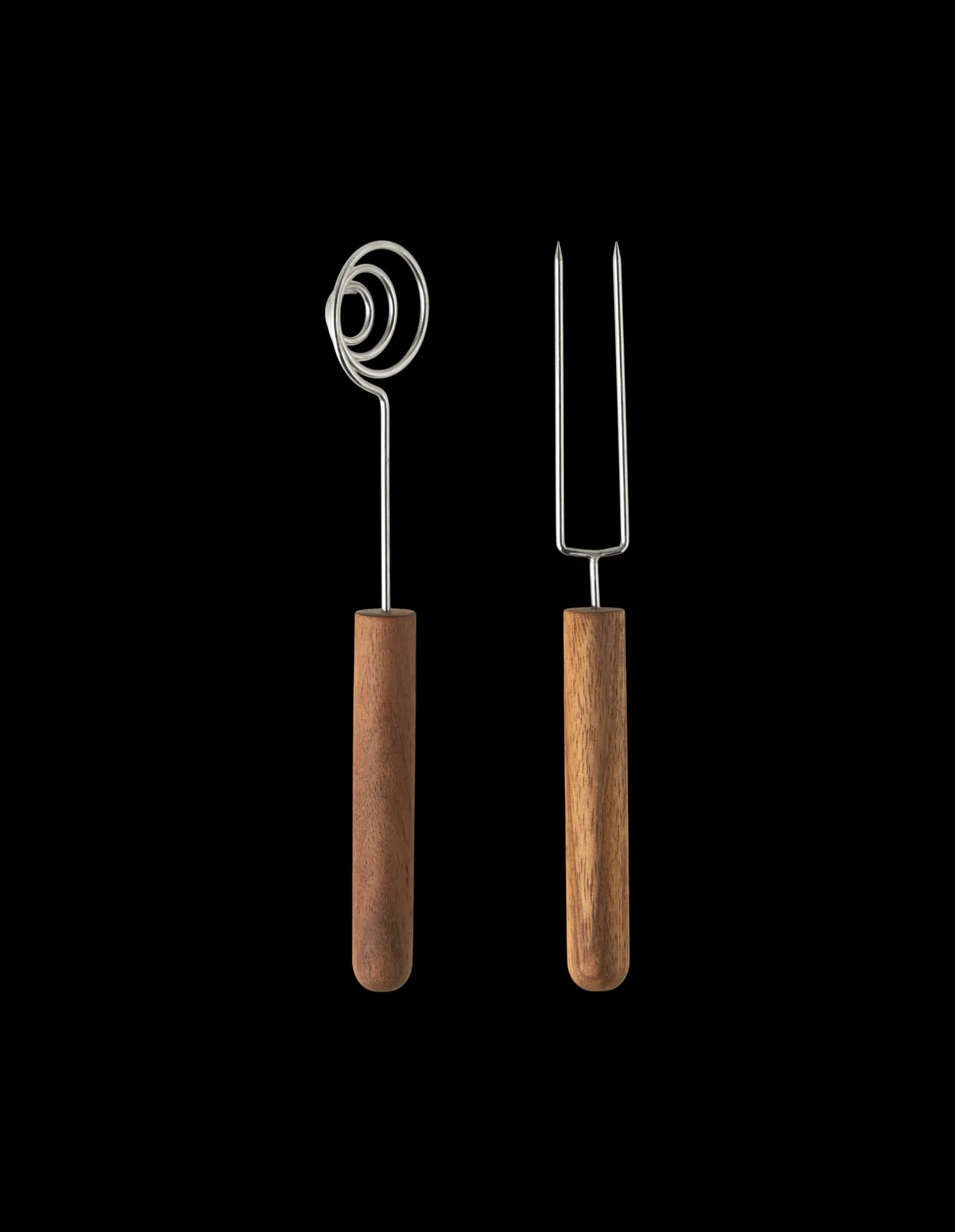 Das Pralinenzubehör der Schwestern besteht aus FSC®-zertifiziertem Akazienholz und Edelstahl. Das Set besteht aus einer Gabel und einem Heber zum Eintauchen.„Umgeben Sie sich mit dem richtigen Zubehör und Utensilien und lassen Sie Ihre wildesten Pralinenträume wahr werden“, sagt Clara mit einem Lächeln.