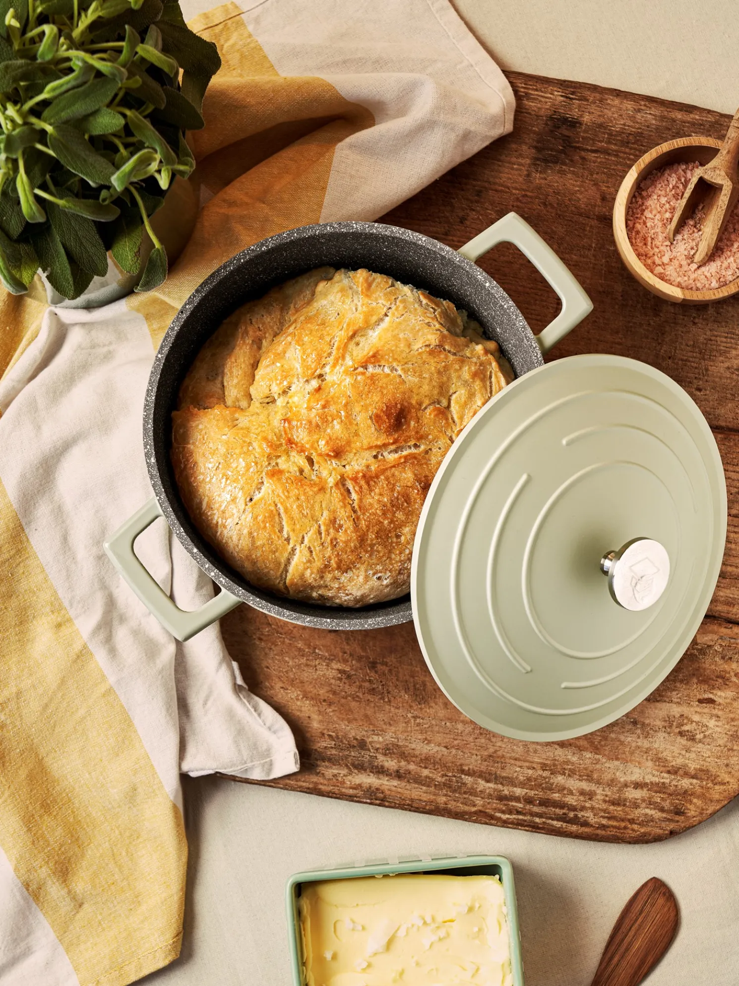 Dieser Schmortopf von MasterClass besteht aus Aluminiumguss, einem leichteren Material als Gusseisen, das ein schnelles und gleichmäßiges Garen von Speisen ermöglicht. Er hat ein Fassungsvermögen von 2,5 Liter. Der Edelstahlboden ermöglicht eine einfache Verwendung auf jeder Kochplatte, einschließlich Induktion, und ist außerdem bis 200 °C backofenfest. Der Schmortopf verfügt über einen Knopf und zwei Griffe sowie einen selbstbefeuchtenden Deckel, der Dampf auffängt, während er sich aufbaut, um ein noch besseres Kocherlebnis zu erzielen. Er hat eine robuste, haltbare, kratzfeste Beschichtung, die als Antihaftbeschichtung fungiert, was auch die Reinigung erleichtert. Außerdem ist der Topf spülmaschinenfest.