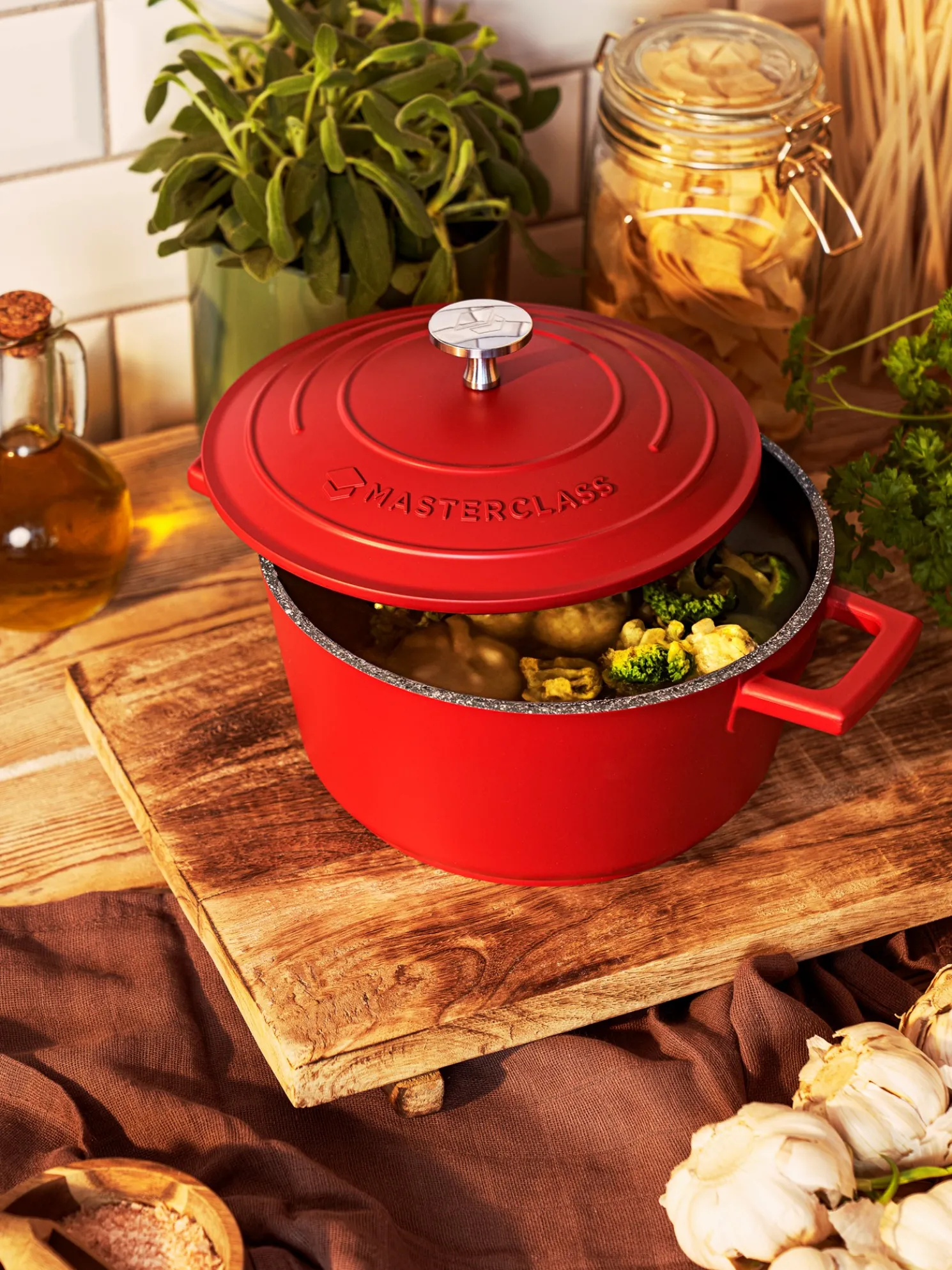 Dieser Schmortopf von MasterClass besteht aus Aluminiumguss, einem leichteren Material als Gusseisen, das ein schnelles und gleichmäßiges Garen von Speisen ermöglicht. Er hat ein Fassungsvermögen von 2,5 Liter. Der Edelstahlboden ermöglicht eine einfache Verwendung auf jeder Kochplatte, einschließlich Induktion, und ist außerdem bis 200 °C backofenfest. Der Schmortopf verfügt über einen Knopf und zwei Griffe sowie einen selbstbefeuchtenden Deckel, der Dampf auffängt, während er sich aufbaut, um ein noch besseres Kocherlebnis zu erzielen. Er hat eine robuste, haltbare, kratzfeste Beschichtung, die als Antihaftbeschichtung fungiert, was auch die Reinigung erleichtert. Außerdem ist der Topf spülmaschinenfest.