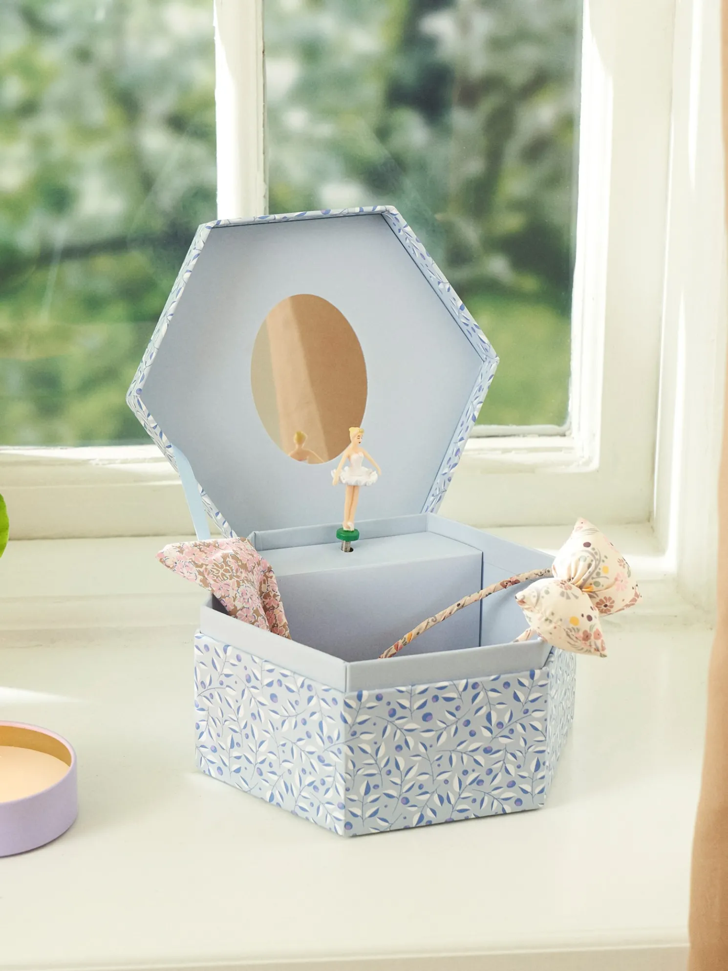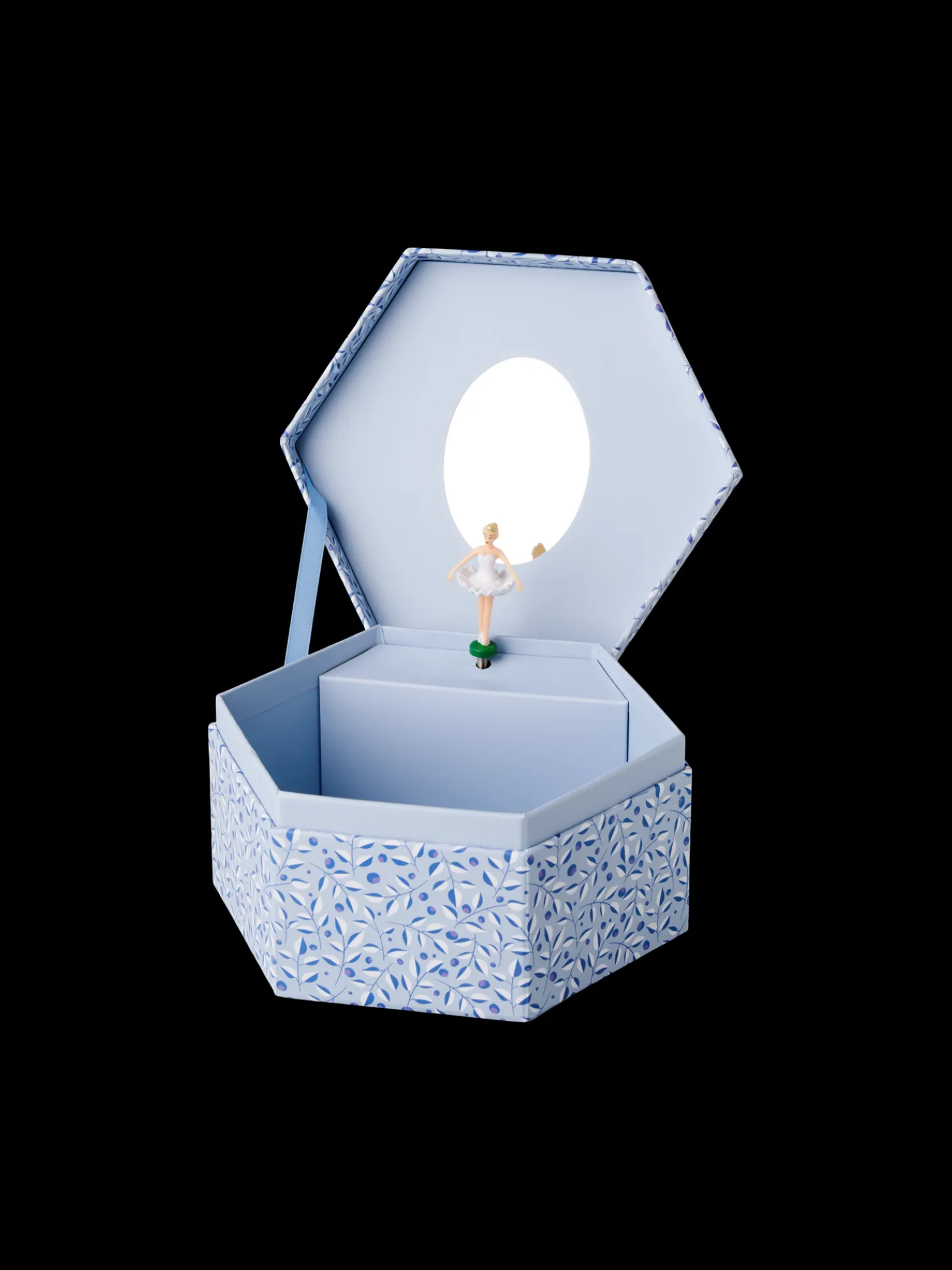 Die Schmuckschatulle der Schwestern besteht aus FSC®-zertifiziertem Papier sowie aus Glas, Polypropylen und Polyester.Wenn die Schmuckschatulle geöffnet wird, dreht sich die kleine Balletttänzerin sachte zur Musik.