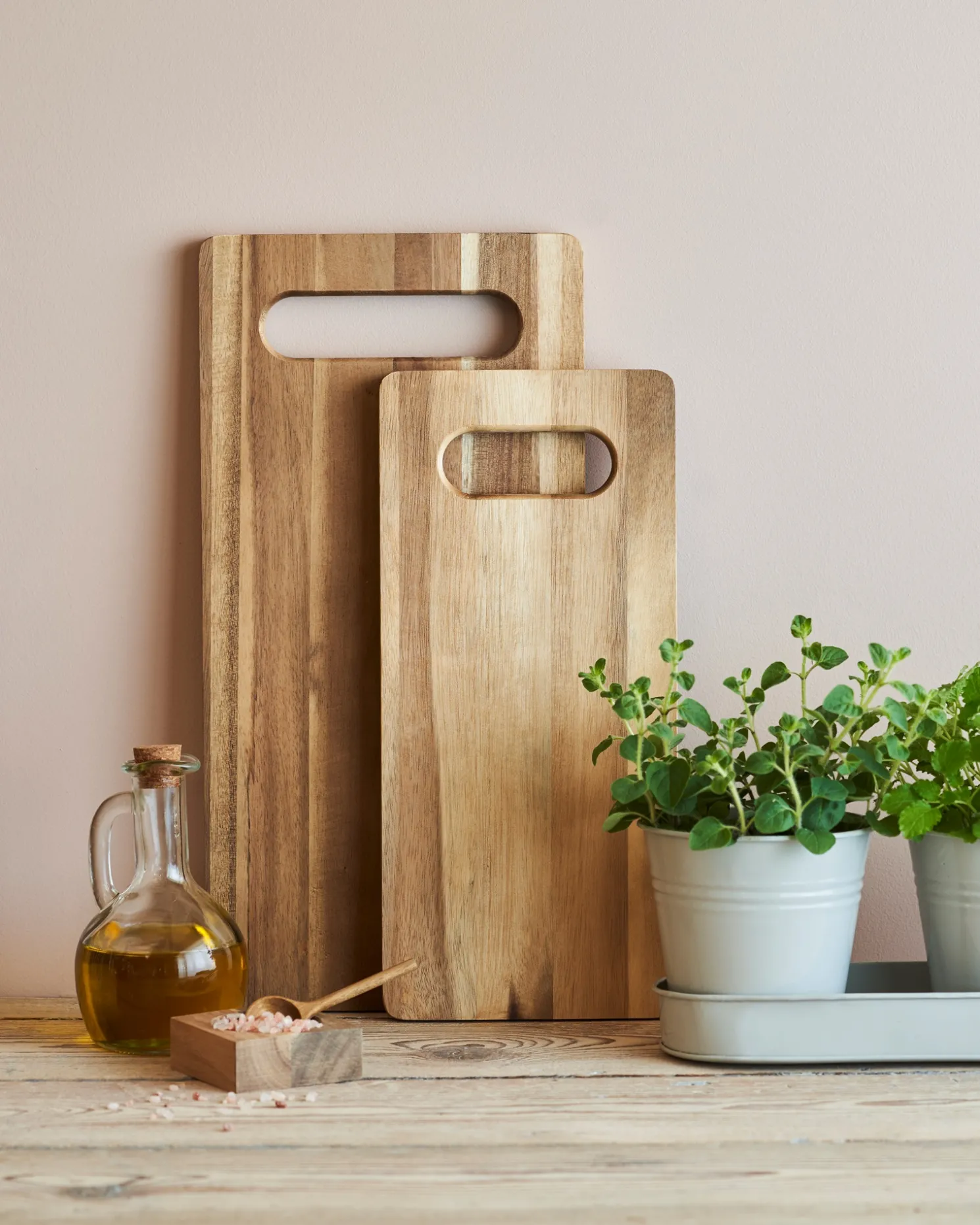 Das Schneidebrett der Schwestern besteht aus FSC®-zertifiziertem Akazienholz und misst 14,5 x 31,5 cm.Da Akazienholz ein natürliches Material ist, weisen die Schwestern darauf hin, dass sich das Produkt in der Farbe leicht unterscheiden kann.