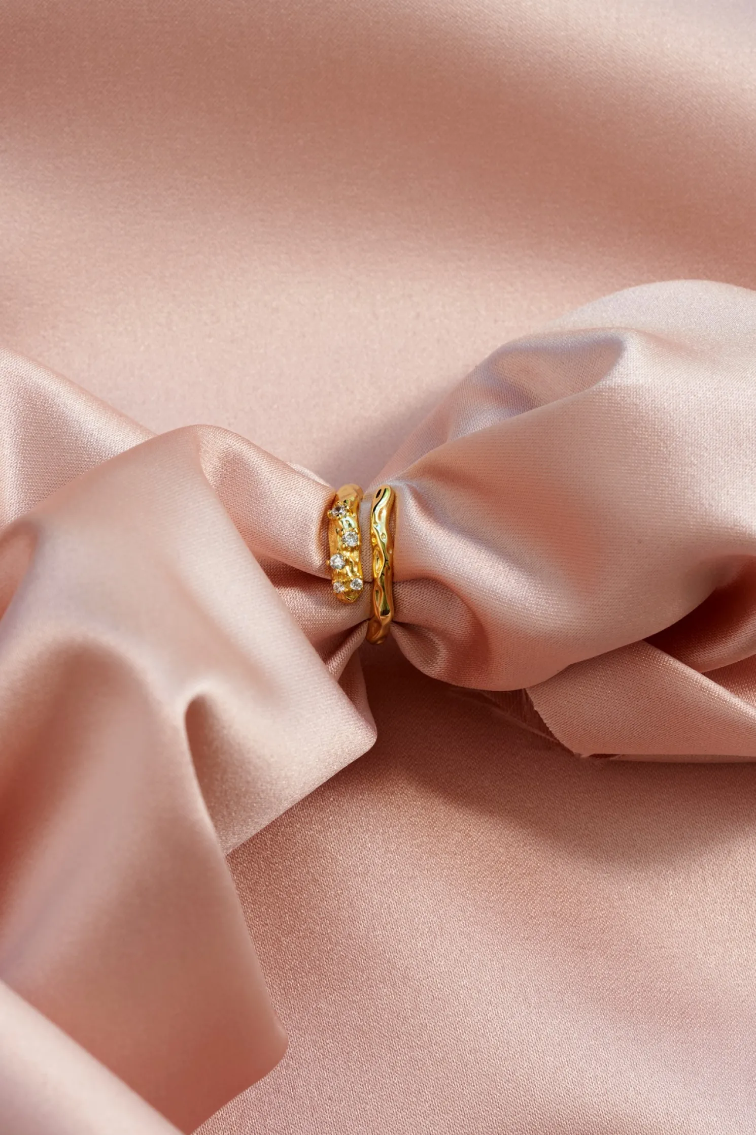 Die Schwestern weisen darauf hin, dass dieses Produkt nur online erhältlich ist.Der Shiny Twist Ring besteht aus 925er Sterlingsilber, ist mit 18 Karat Gold überzogen und mit einigen Zirkonia verziert. Der Ring ist größenverstellbar und wird in einer schönen kleinen Schmuckbox geliefert. „Die Zirkonia auf dem Ring sorgen für einen Hauch von Glanz“, sagt Clara lächelnd. „Ein eleganter Ring, der alleine wunderschön aussieht, aber auch zusammen mit anderen Ringen getragen werden kann.“ Anna und Clara weisen darauf hin, dass Sie den direkten Kontakt mit Feuchtigkeit und Flüssigkeiten vermeiden sollten, um eine bessere Haltbarkeit der Vergoldung zu gewährleisten.