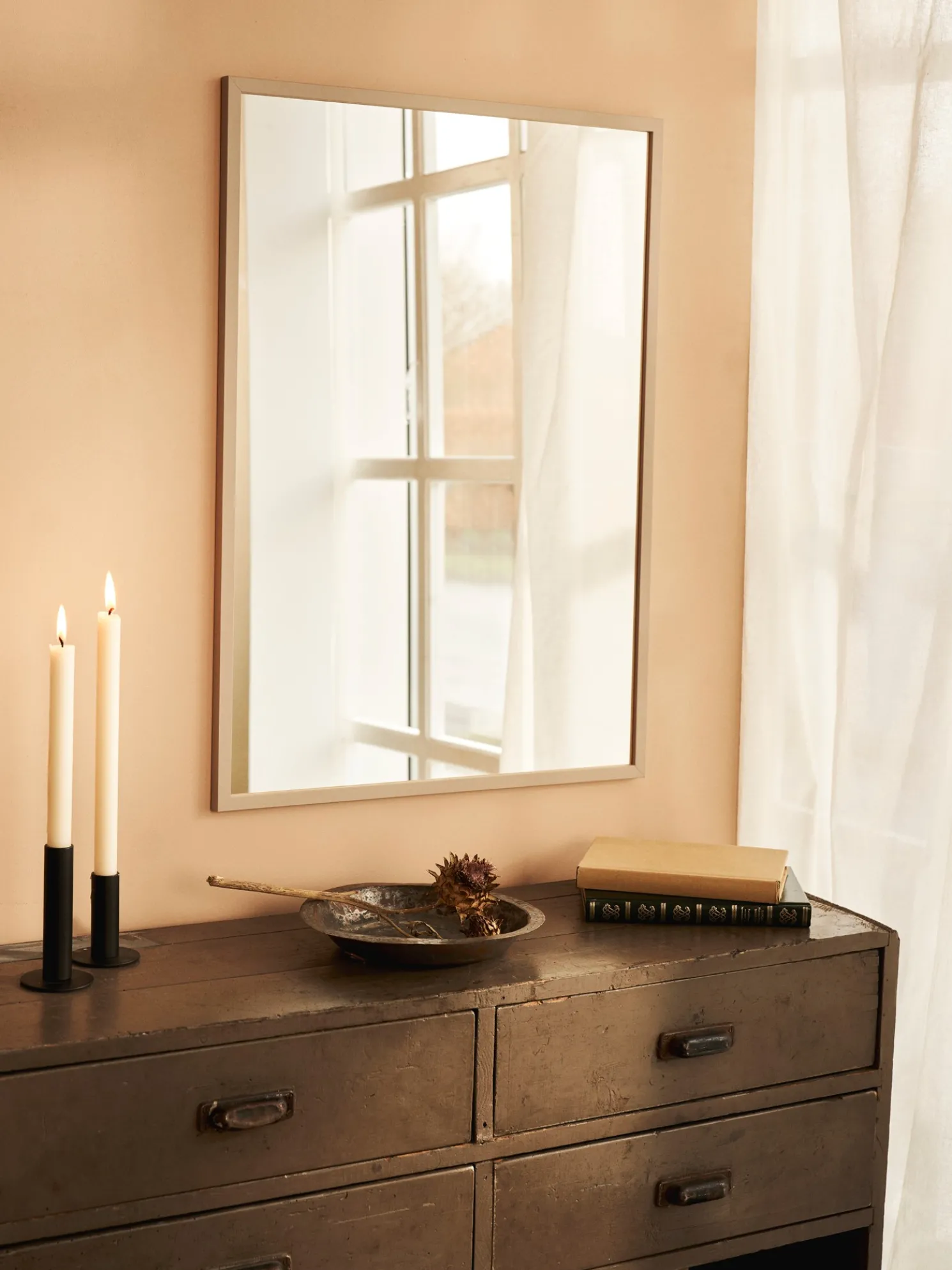 Dieser schöne Spiegel der dänischen Marke Poster & Frame hat einen Holzrahmen und wird in Dänemark hergestellt. Die hochwertigen Materialien vereinen sich zu einer wunderbaren Verbindung von Funktionalität und Design. Die Schwestern weisen darauf hin, dass Holz ein natürliches Material ist und daher der Ausdruck und die Farbe des Rahmens variieren können.
