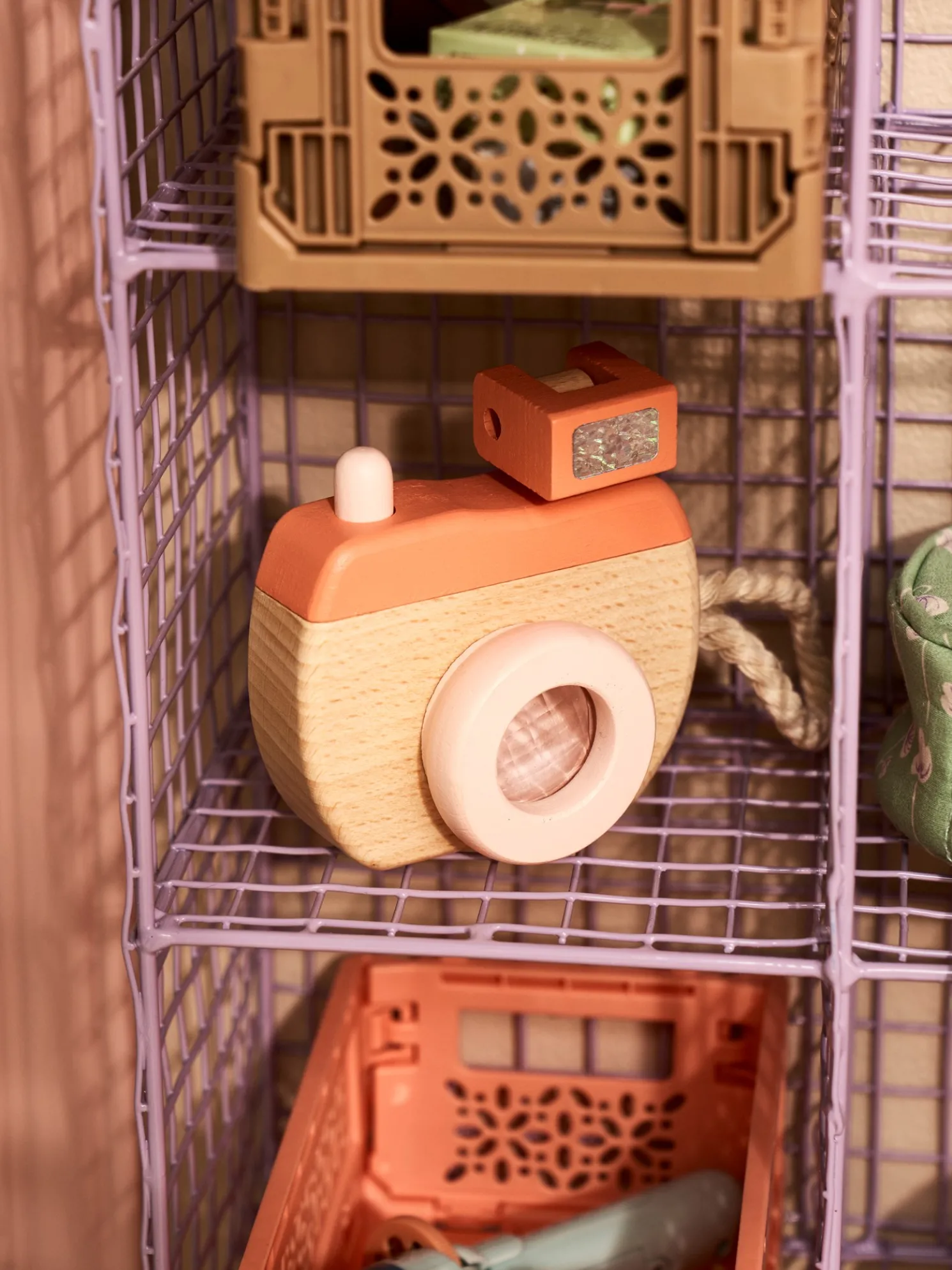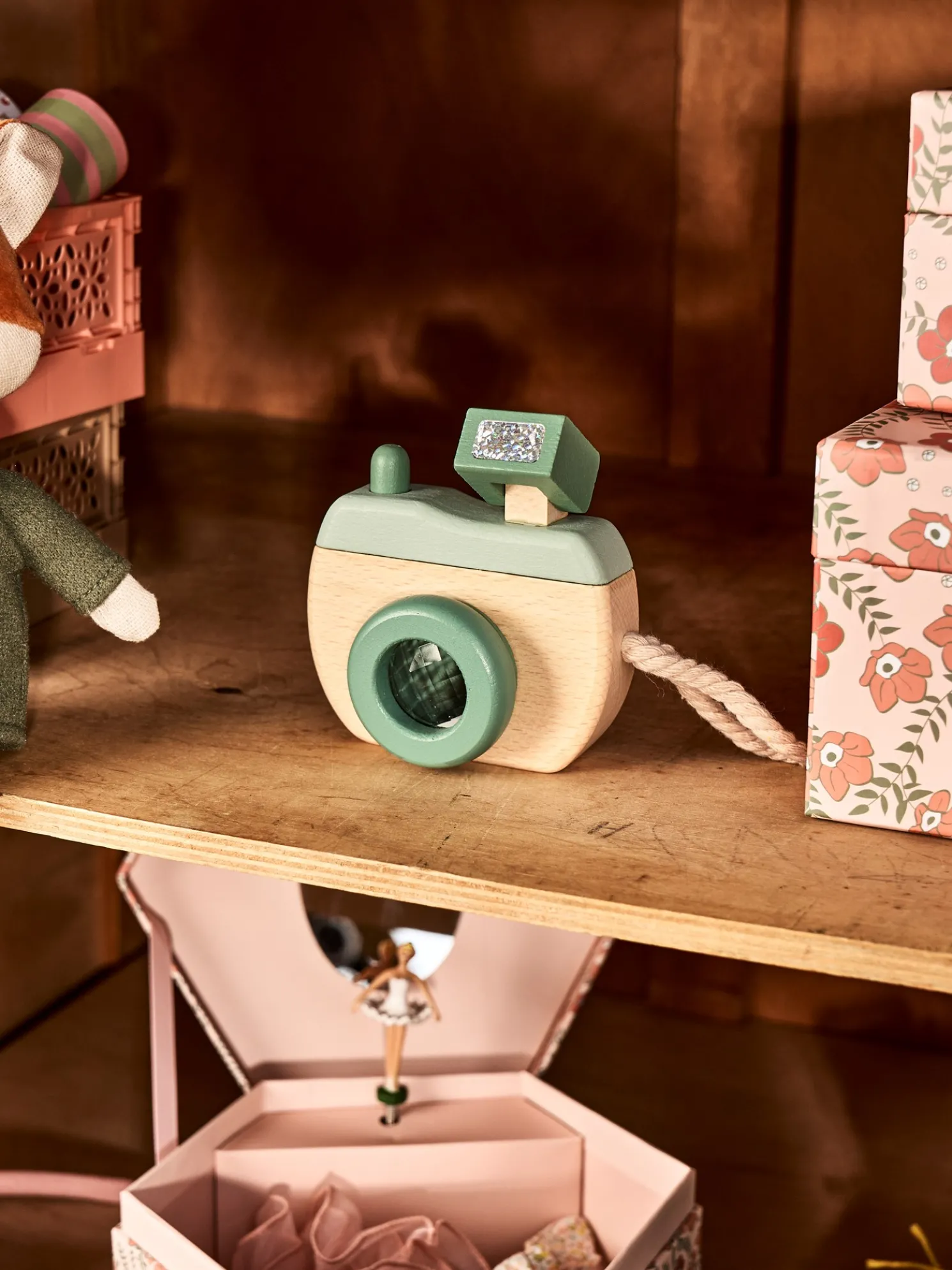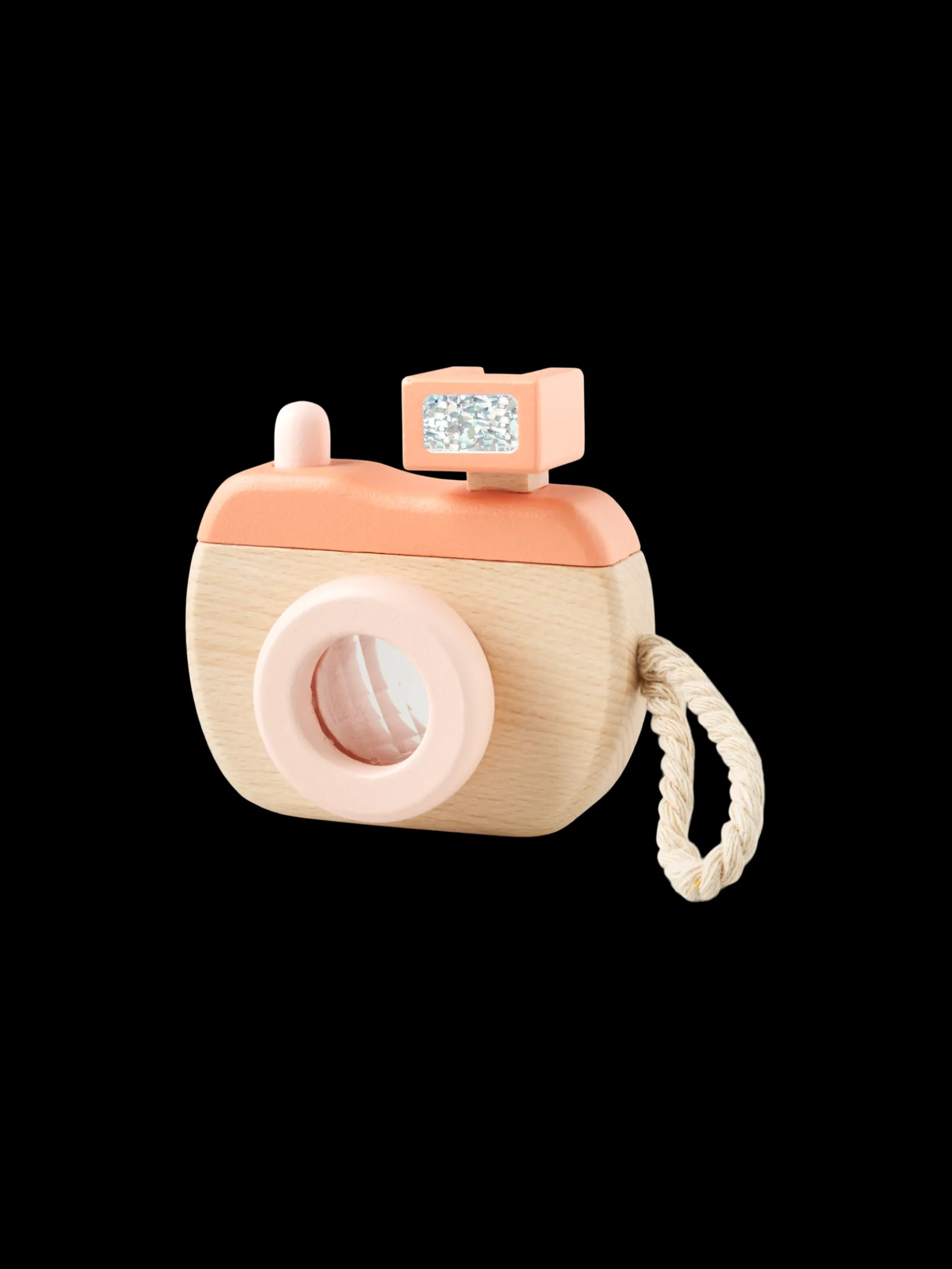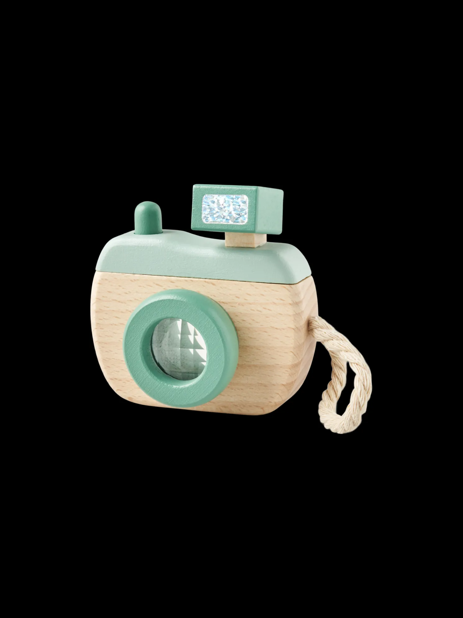 Die Spielzeugkamera der Schwestern besteht aus 100 % FSC®-zertifiziertem Buchenholz und verfügt über ein kurzes Baumwollseil für einfachen Halt. Sie misst 11,5 x 8,5 x 4 cm.