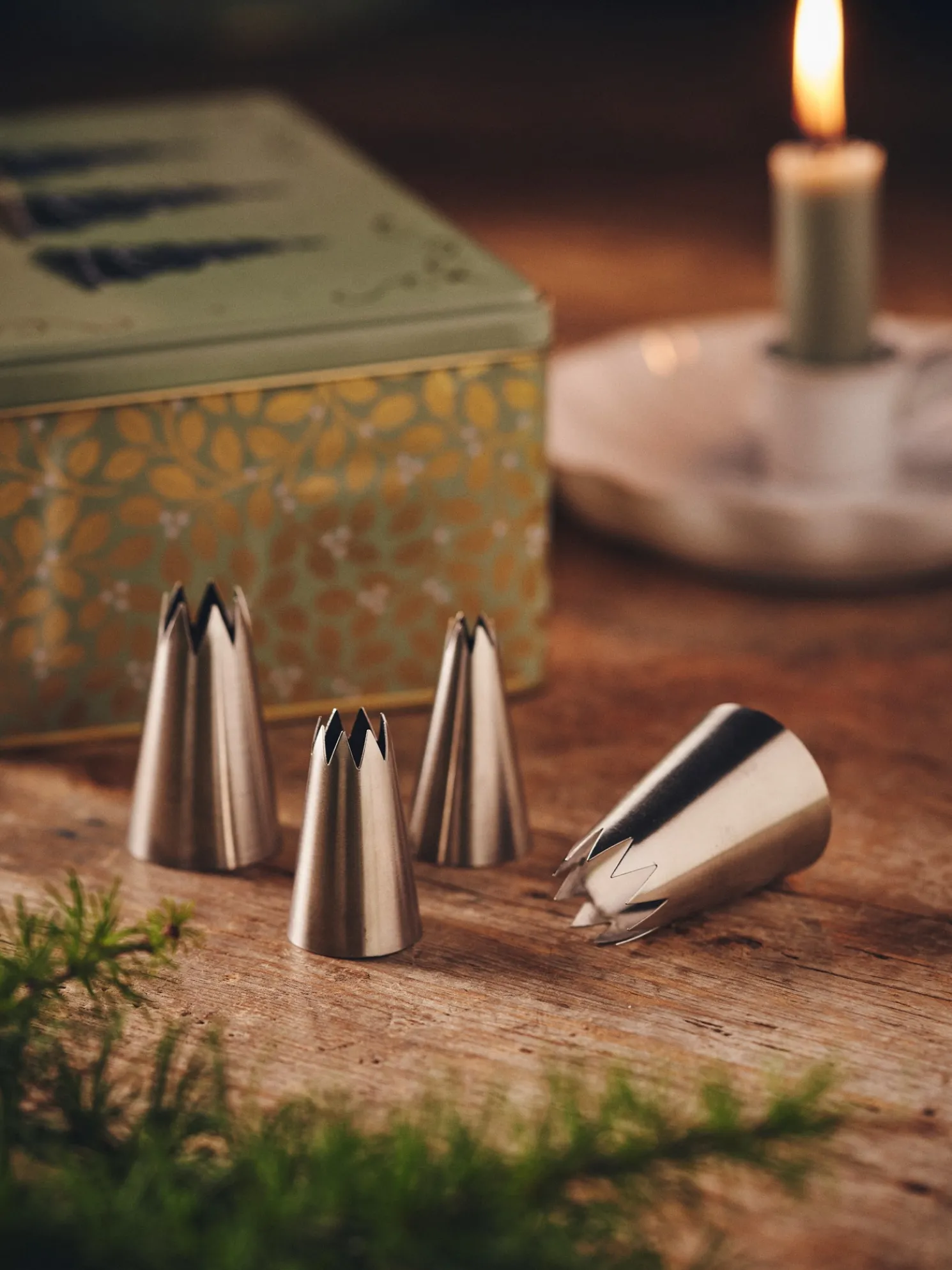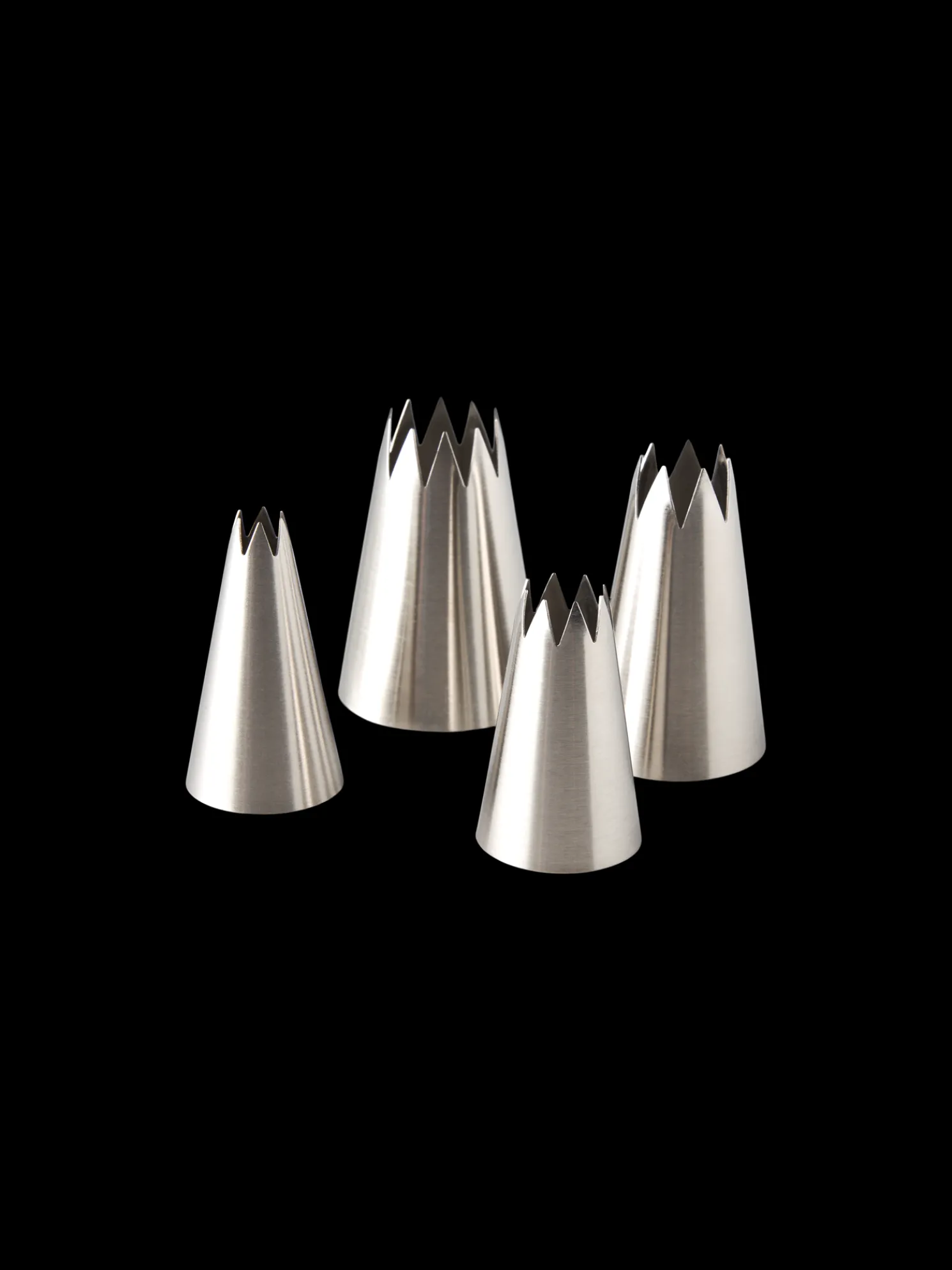 Die Spritztüllen der Schwestern sind aus Edelstahl gefertigt. Eine Packung enthält 4 Tüllen in folgenden Größen: 8 mm, 12 mm, 14 mm und 18 mm.