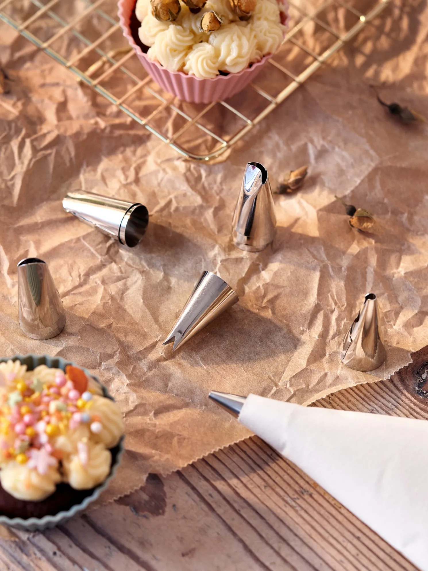 Die Spritztüllen der Schwestern sind aus Edelstahl gefertigt und eine schöne Ergänzung für jede Küche. Eine Packung enthält 10 Stück.