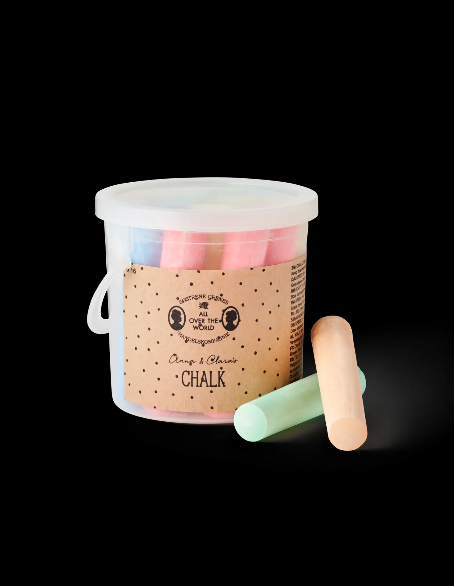 Anna und Clara sitzen im Garten und genießen einen warmen Sommertag. Draußen auf dem Fußweg sind der Neffe und die Nichten damit beschäftigt, mit Kreide zu malen. „Zeichnen Sie Hüpfkästchen auf die Straße“, schlägt Clara vor. „Das ist ein Spaß.“ Der Kreide-Eimer der Schwestern enthält 16 wunderschöne Straßenkreiden in bezaubernden Farben. Die dicke Kreide sorgt für viele Stunden Spaß, in denen die Kleinen schöne und einfallsreiche Zeichnungen auf Asphalt oder Fliesen anfertigen können.