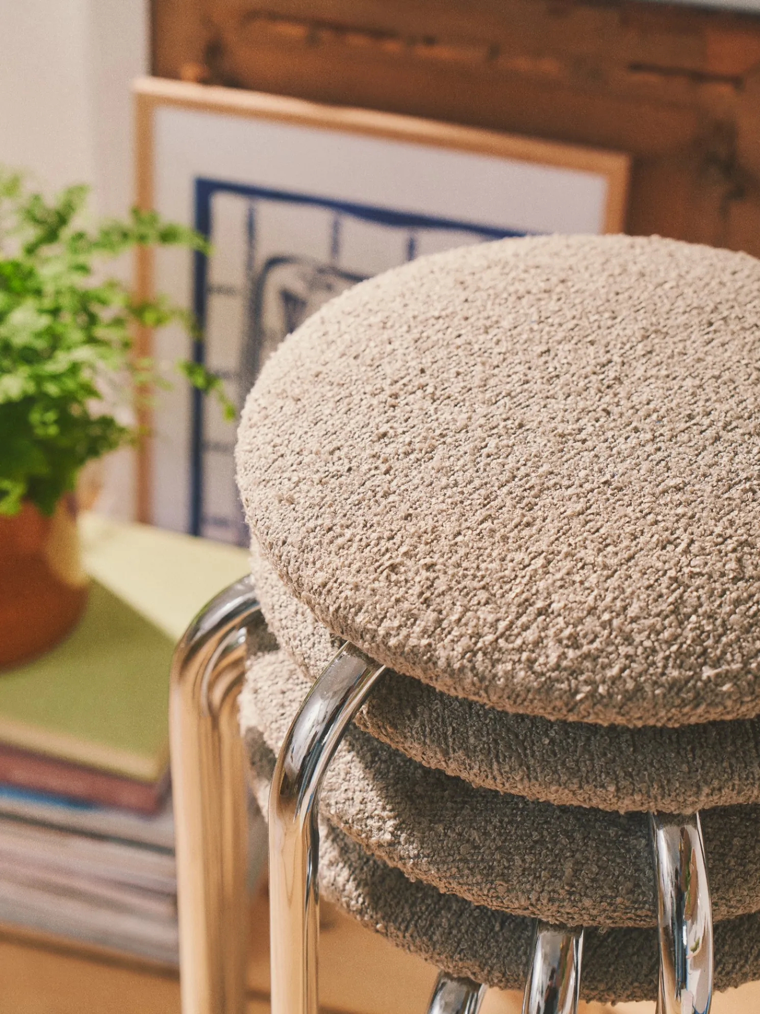 Der Hocker mit Bouclé-Stoff hat eine FSC®-zertifizierte MDF-Basis und kann ein einfacher zusätzlicher Sitzplatz in Ihrem Zuhause sein.