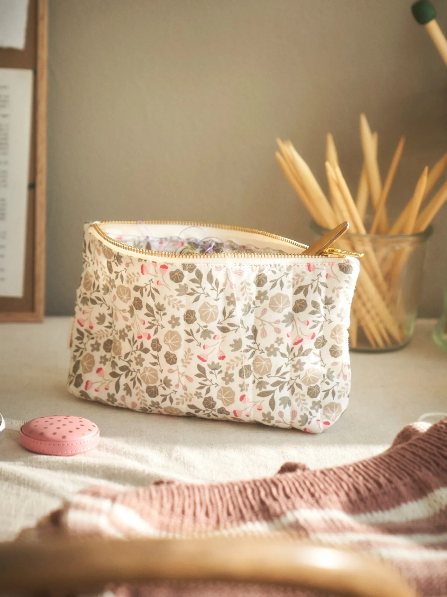 Das Täschchen der Schwestern besteht 70 % GOTS-zertifizierter Bio-Baumwolle und 30 % Polyester. Beutel wie diese eignen sich hervorragend als Stricktaschen oder zur Aufbewahrung von Häkelnadeln und Maschenmarkierern.