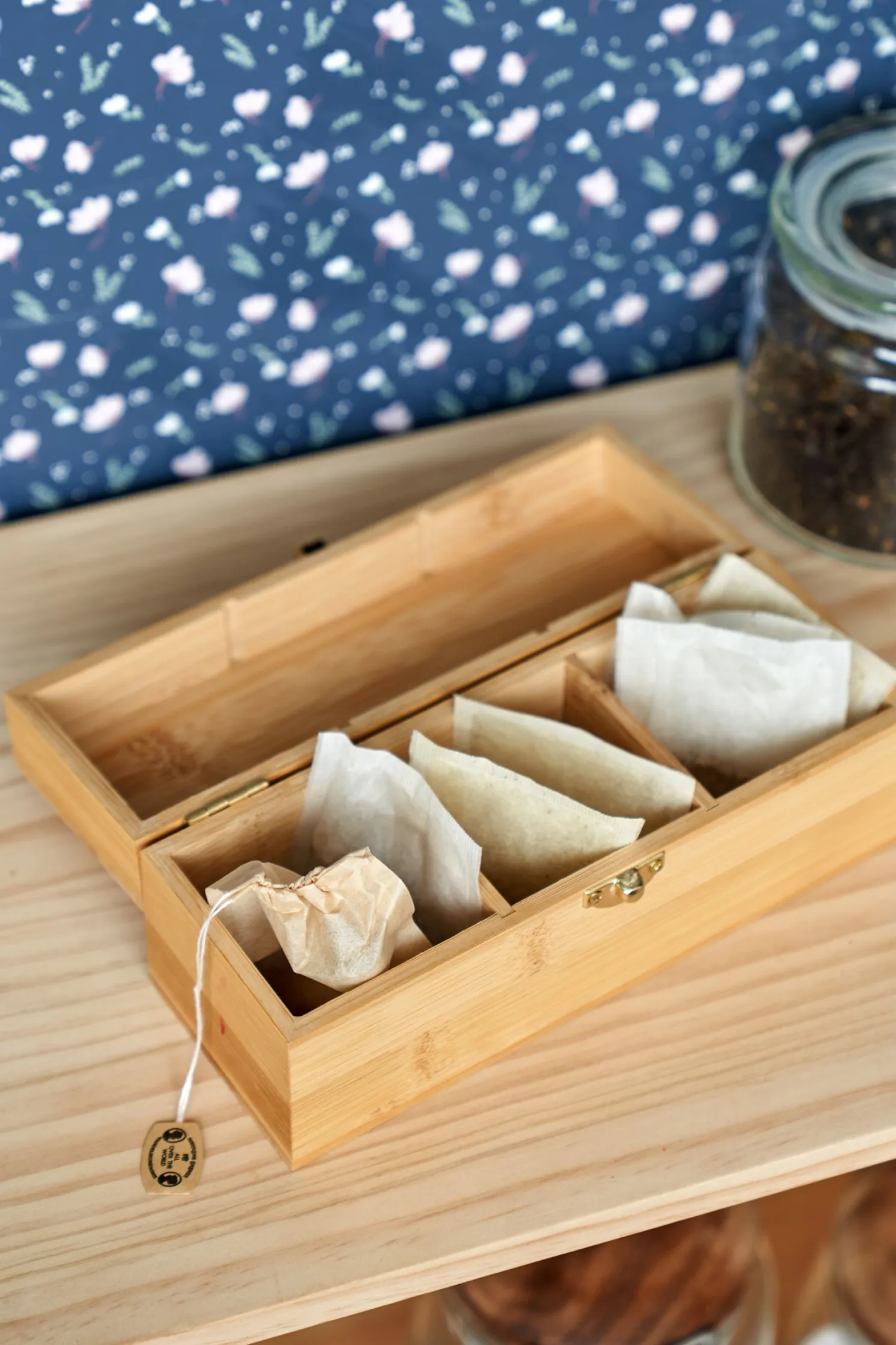 Die Teebox der Schwestern besteht aus FSC®-zertifiziertem Bambus und misst 20,5 x 8 x 7,5 cm.Da Bambus ein natürliches Material ist, weisen die Schwestern darauf hin, dass sich das Produkt in der Farbe leicht unterscheiden kann.