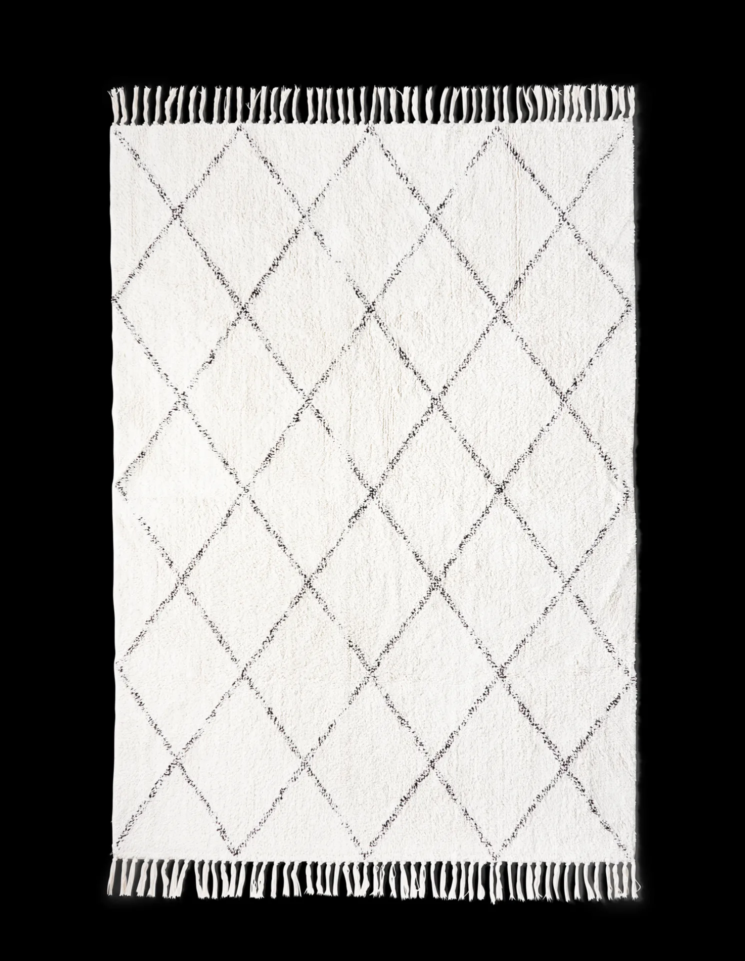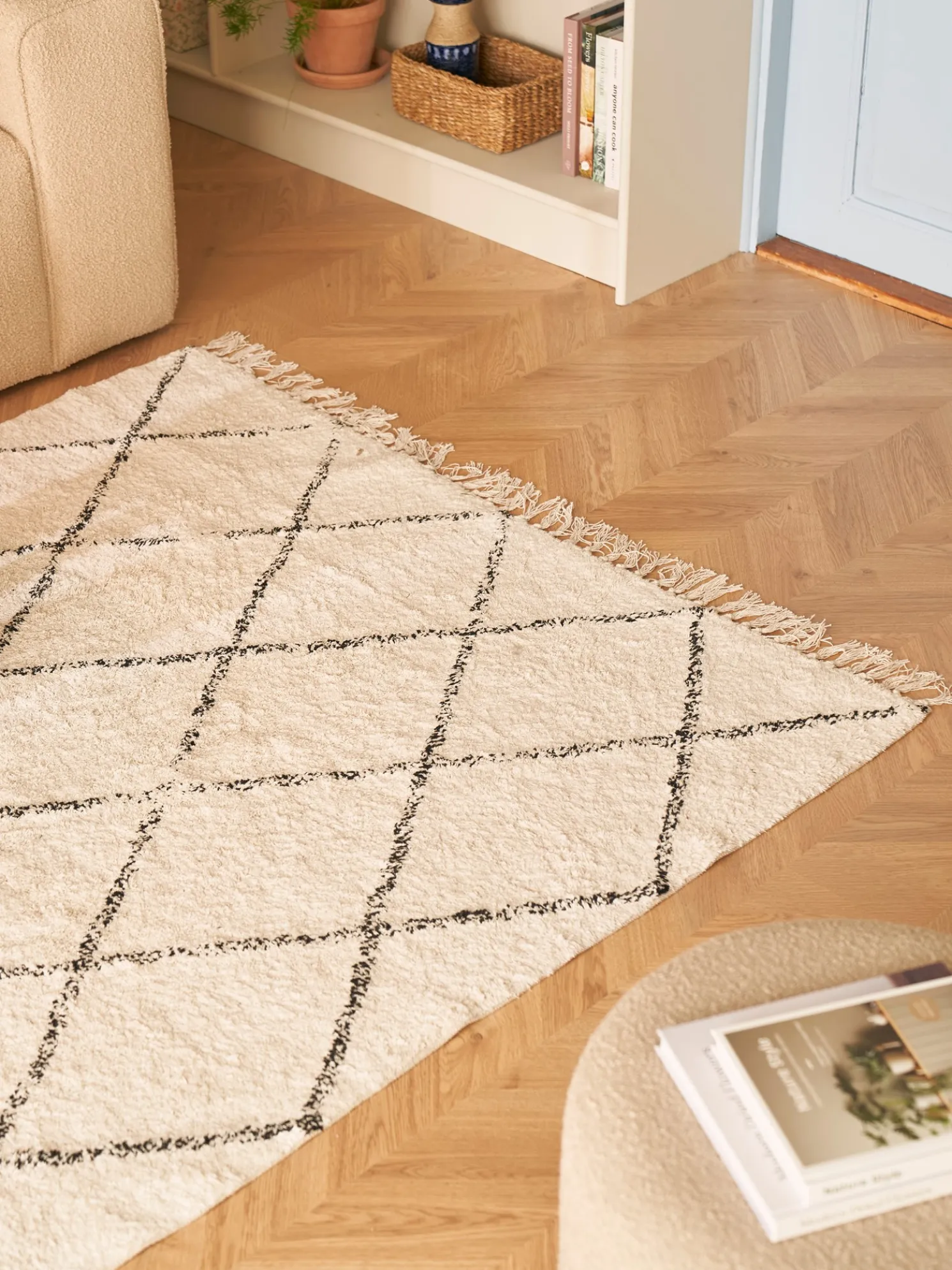 Anna und Clara haben ihren Flur mit warmen Farben und natürlichen Materialien eingerichtet. Die Schwestern haben weiche Teppiche auf den Fußboden gelegt und wundervolle geflochtene Kunstwerke an die Wand gehängt. „So heißen Ruhe und Wärme unsere Gäste willkommen“, sagt Clara. Clara hat diesen Teppich mit Rhomben verziert, die nun auf feinste Weise den Boden schmücken. Der Teppich der Schwestern ist aus Baumwolle und misst 190 x 135 cm.