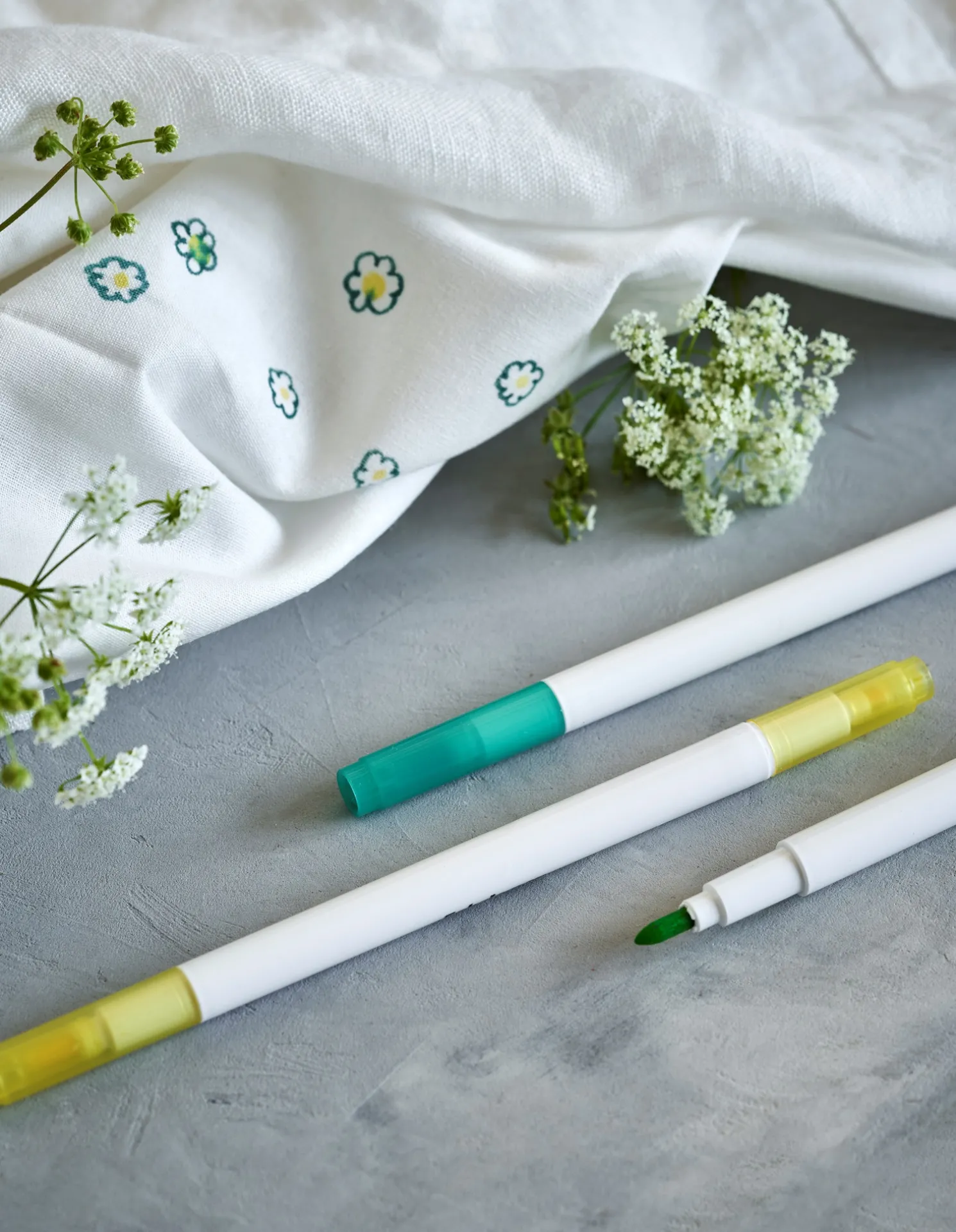 Personalisieren Sie Ihre Kleidung mit den schönen 2-in-1 Textilstiften der Schwestern. Eine Packung enthält 12 Textilstifte in wunderbaren Farben.
