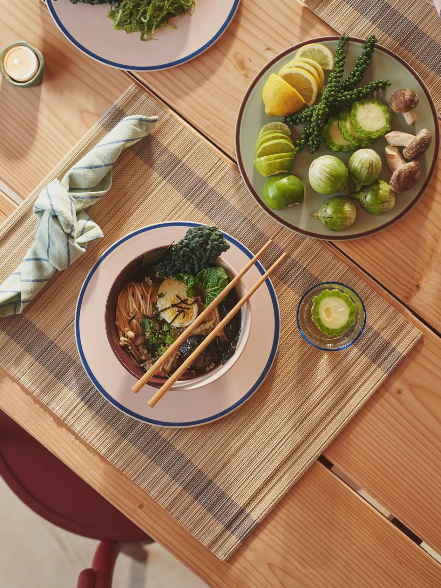 Das Tischset der Schwestern besteht aus 100 % FSC®-zertifiziertem Bambus und misst 45 x 35 cm. Es kann zusammengerollt werden, um es nach dem Essen einfach zu verstauen.