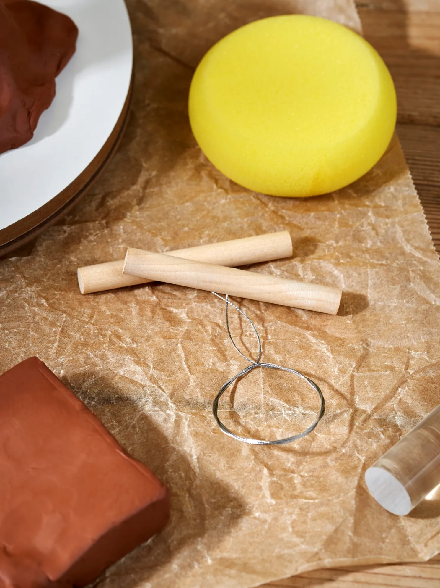 Das kreative Tonset der Schwestern besteht aus einem Schwamm mit einem Durchmesser von 7,5 cm und einem Tonschneider mit Holzstäben mit einem Durchmesser von 9 mm und einem Draht à 42 cm.